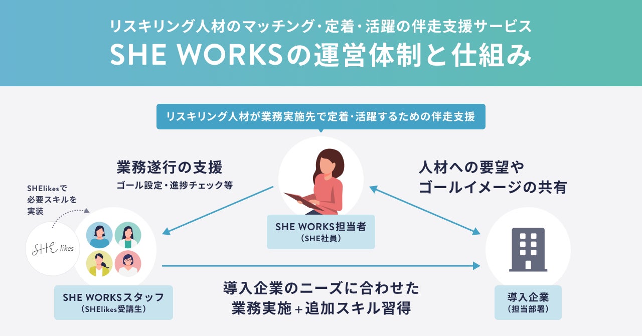SHE WORKS(https://sheworks.shelikes.jp/)は、SHElikesで学んだリスキリング人材のマッチングから業務の定着・活躍まで一気通貫して行い、人材が企業でワークできるようになるまで伴走支援するサービスです。