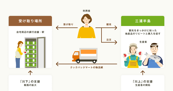 三浦半島の地産品の販路拡大の支援を目的に、クックパッドが運営する生鮮食品EC「クックパッドマート」の商品受け取り場所である生鮮宅配ボックス「マートステーション」を京急線駅構内、横浜銀行店舗内に設置します。また、共同で三浦半島の「生産者」や「食品関連事業者」を開拓するとともに、「クックパッドマート」アプリ内では三浦半島の地産品特集の実施などで「食」を通じた地域活性化を行います。
