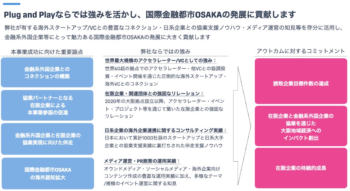 Plug and Play Japan株式会社(本社:東京都渋谷区、代表取締役社長:ヴィンセント・フィリップ、以下「Plug and Play Japan」)は、大阪府(知事:吉村 洋文)、大阪市(市長:横山 英幸)が実施する「令和7年度国際金融都市OSAKA金融系外国企業等誘致事業」の最優秀提案事業者として採択されたことをお知らせいたします。
