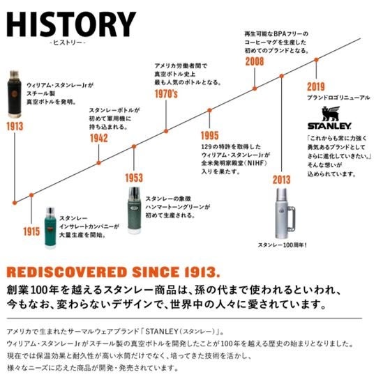 1913年、アメリカで生まれたサーマルウェアブランド。創業100年を超えたスタンレーの商品は、孫の代まで使えるといわれ、今もなお、ユニークでオリジナルなデザインで、世界中の人々に愛され続けています。「スタンレーボトルを持つことは、良質のギアを手にするということ」、このシンプルな約束を、創業以来ひたむきに守り続けています。