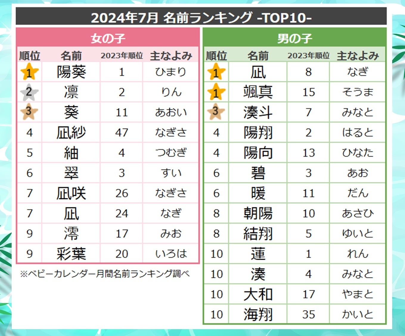 本格的な夏が到来した7月の名前ランキングでは「凪」や「夏」を使った名前が増加しました。よみランキングでも、2位「なぎさ」、21位「なぎ」、58位「なつき」・「こなつ」、90位「なつめ」など、夏らしいよみが増加しました。