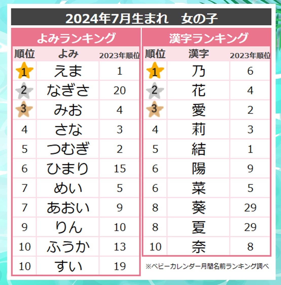 また、七月七日の「七夕」にちなんだ「七」のつく名前も増加。「七」は6月73位から、7月は34位へと大きくランクアップしていました。