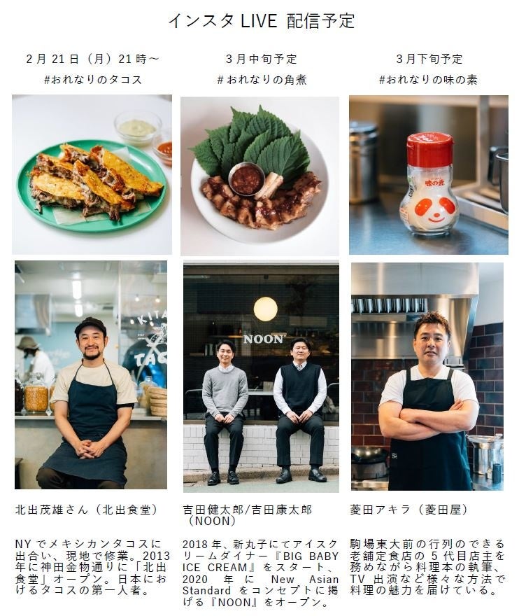 とはいえ、プロの技も見ておきたいということで、DJで中東料理研究家のサラーム海上さんをMCに迎え、あの名店の店主による永久保存版スペシャル料理番組インスタライブの配信も決定! 馴染み深いあの調味料をプロたちがどう使うかも注目だ。