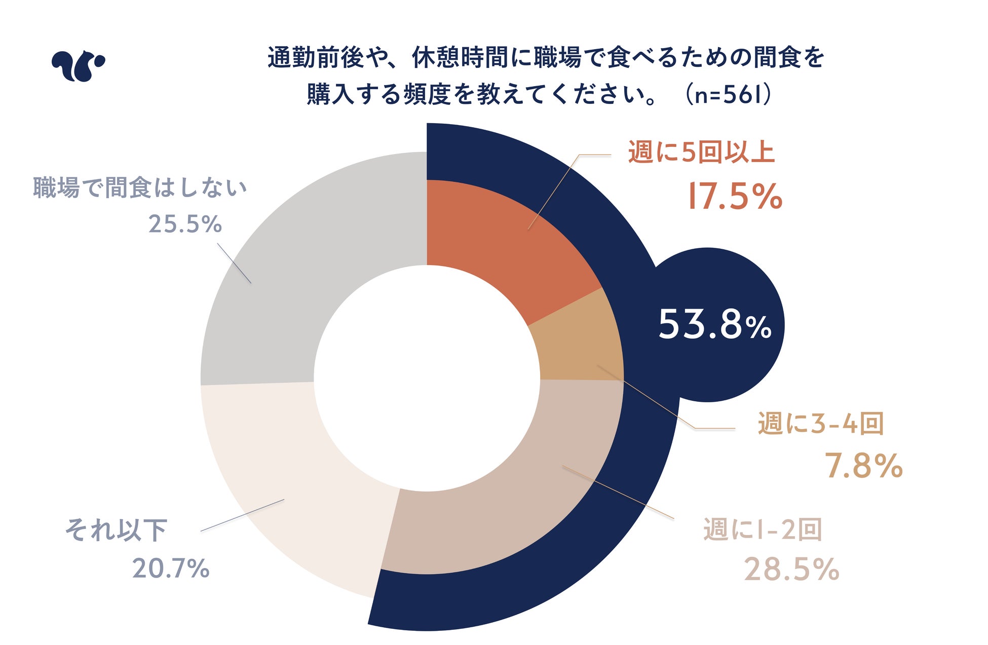 職場で食べるための間食を購入する頻度について聞いたところ、週に5回以上(≒ほぼ毎日)間食を購入している人が17.5%、週に1回以上購入している人は合計で53.8%という結果になった。