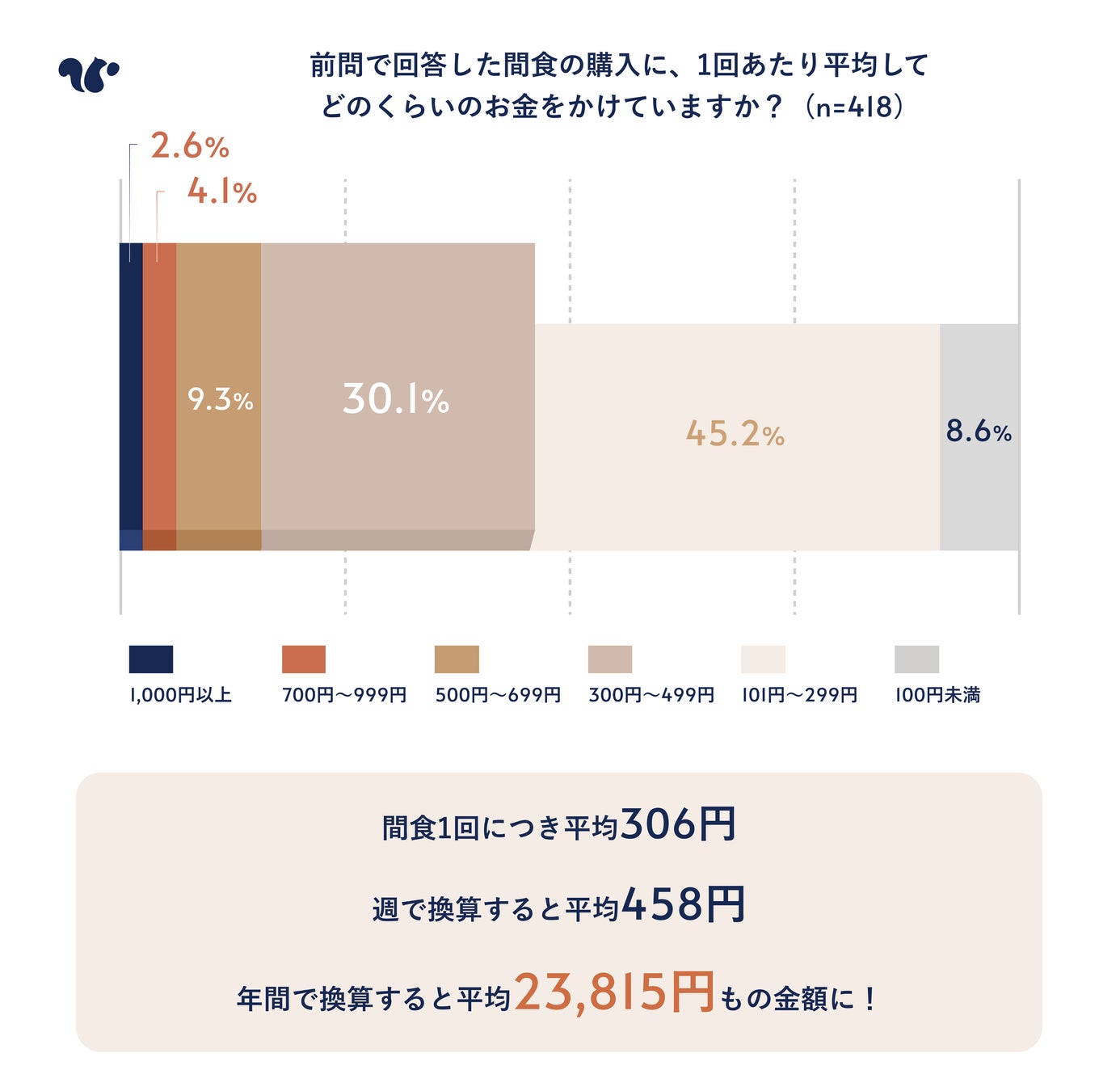 職場で食べるための間食に使う金額を聞いたところ、1回平均306円、週で換算すると平均458円(※)、年間で換算すると平均23,815円(※)、仕事中の間食にお金をかけていることがわかった。