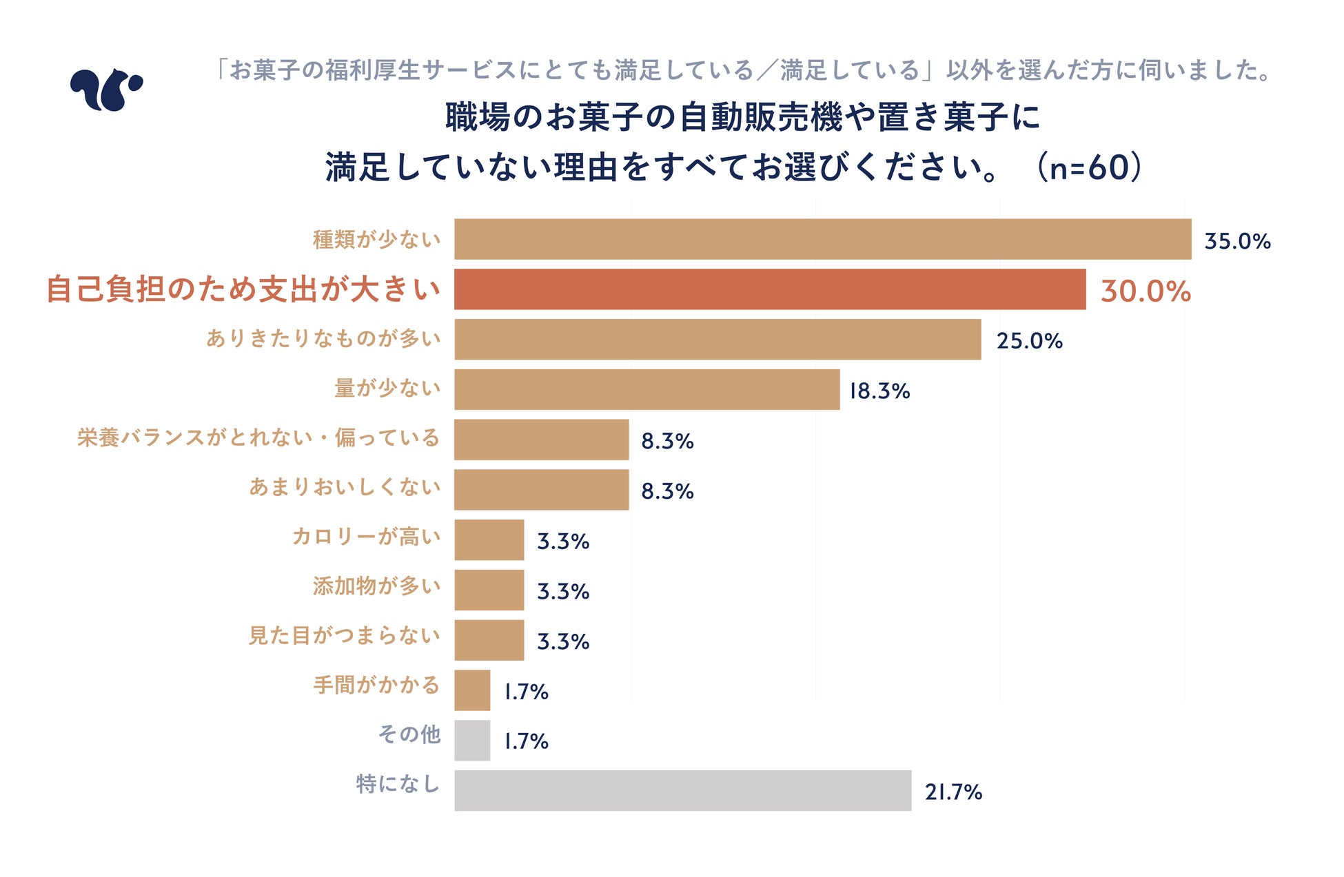 ・「自身の職場でお菓子の自動販売機型や置き菓子を利用している」と答えた人の中で、3人に1人は満足していないと回答した。理由としては、「種類が少ない」の次に「自己負担のため支出が大きい」が多い結果となり、お菓子の福利厚生サービスを導入するのであれば自己負担のない形式で提供したほうがより従業員満足度をあげられると考えられる。