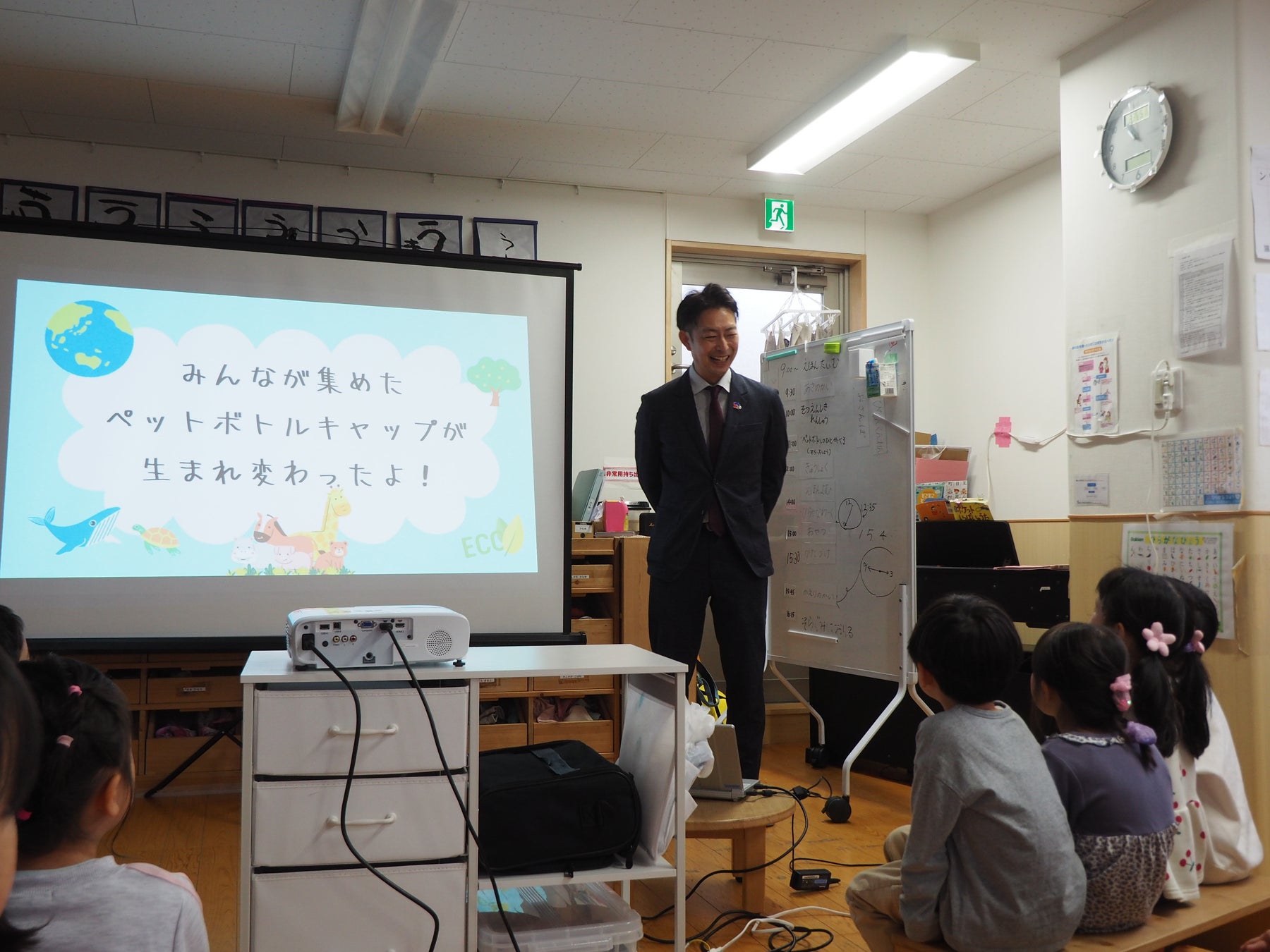 環境学習では、日本山村硝子のご担当者様より、園児たちが集めたペットボトルキャップがどのように回収・分別され、リサイクルされてプランターへと生まれ変わるのかを、スライドショーを交えながら分かりやすく説明いただきました。