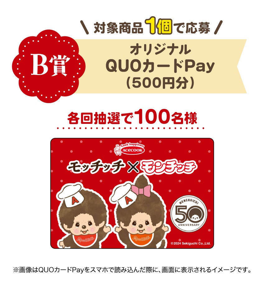 株式会社クオカード(以下当社、本社:東京都中央区、代表取締役社長:近田 剛)が展開するスマートフォンで使えるデジタルギフト『QUOカードPay(クオ・カード ペイ)』は、エースコック株式会社(本社:大阪府吹田市、代表取締役社長: 村岡 寛人)が今年で誕生50周年を迎えた「モンチッチ」とコラボして開催する「モッチッチ×モンチッチ オリジナルグッズが当たる!キャンペーン」で採用されました。本キャンペーンでは、期間中対象商品を購入したレシートで応募すると、オリジナルQUOカードPay500円分などの豪華賞品がプレゼントされます。