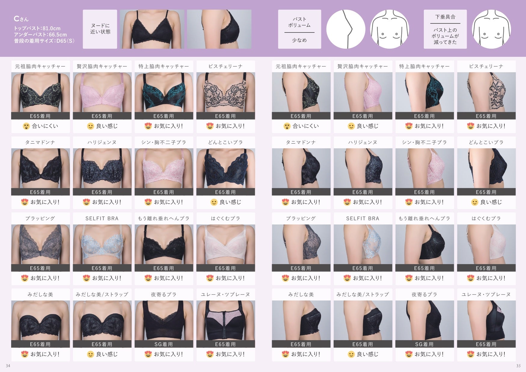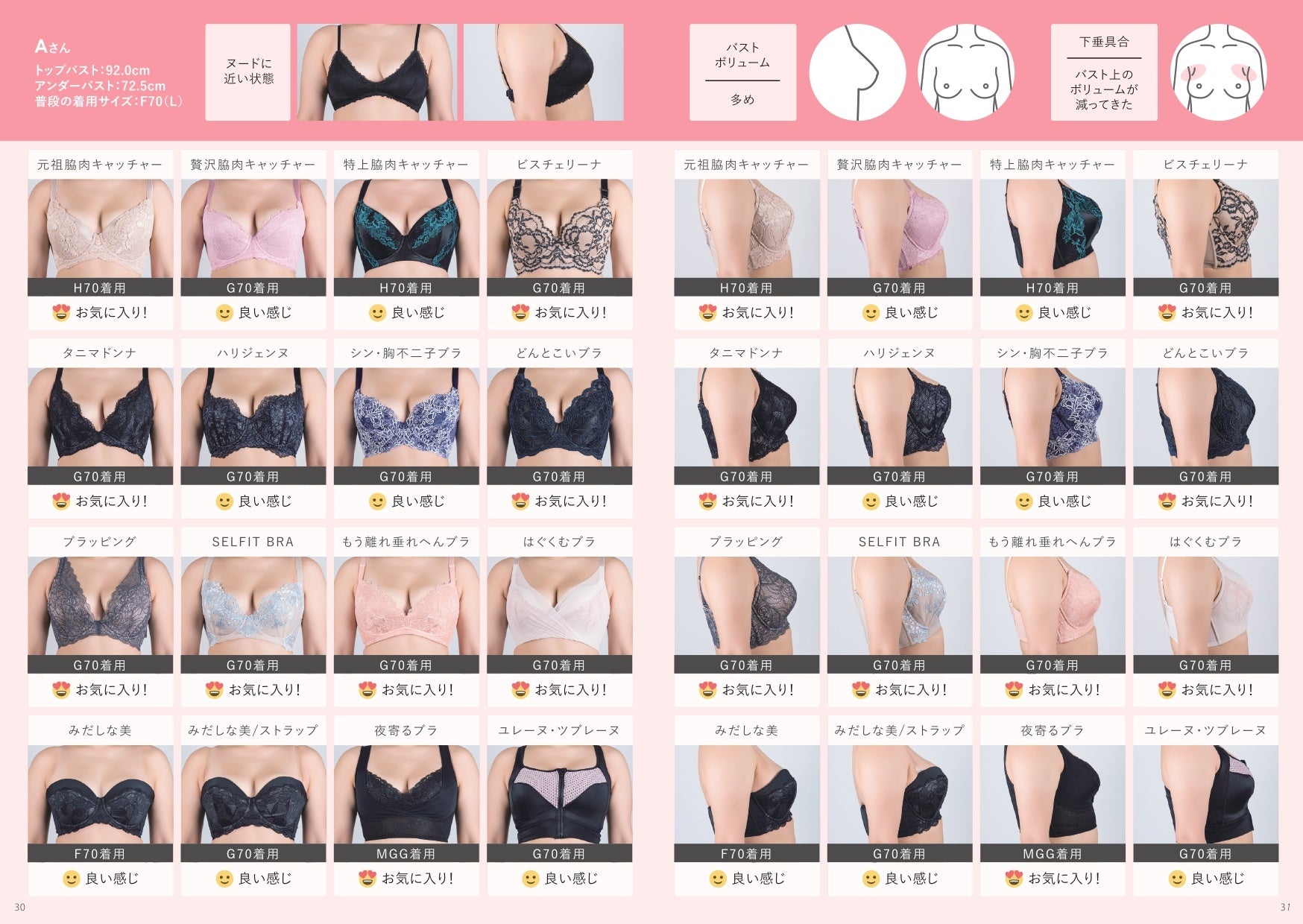 ブラジャーは体形や肉質が異なるとシルエットのイメージも変わります。ヘブンジャパンのカタログでは、体形が異なる4タイプの女性の着け比べ写真をアイテムごとに掲載。自分に近い体形の着用写真を参考にすることで、着用時のイメージを湧きやすくしています。