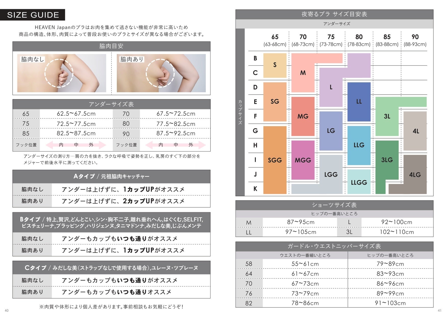 体形や骨格、バストの形は人それぞれで違うため、自分にぴったり合ったブラジャーのサイズ選びはとてもデリケートです。そこで本カタログではホック位置でのアンダーサイズの違いや、脇肉の有無といった体形に合わせてサイズを選べるように目安が記載されています。