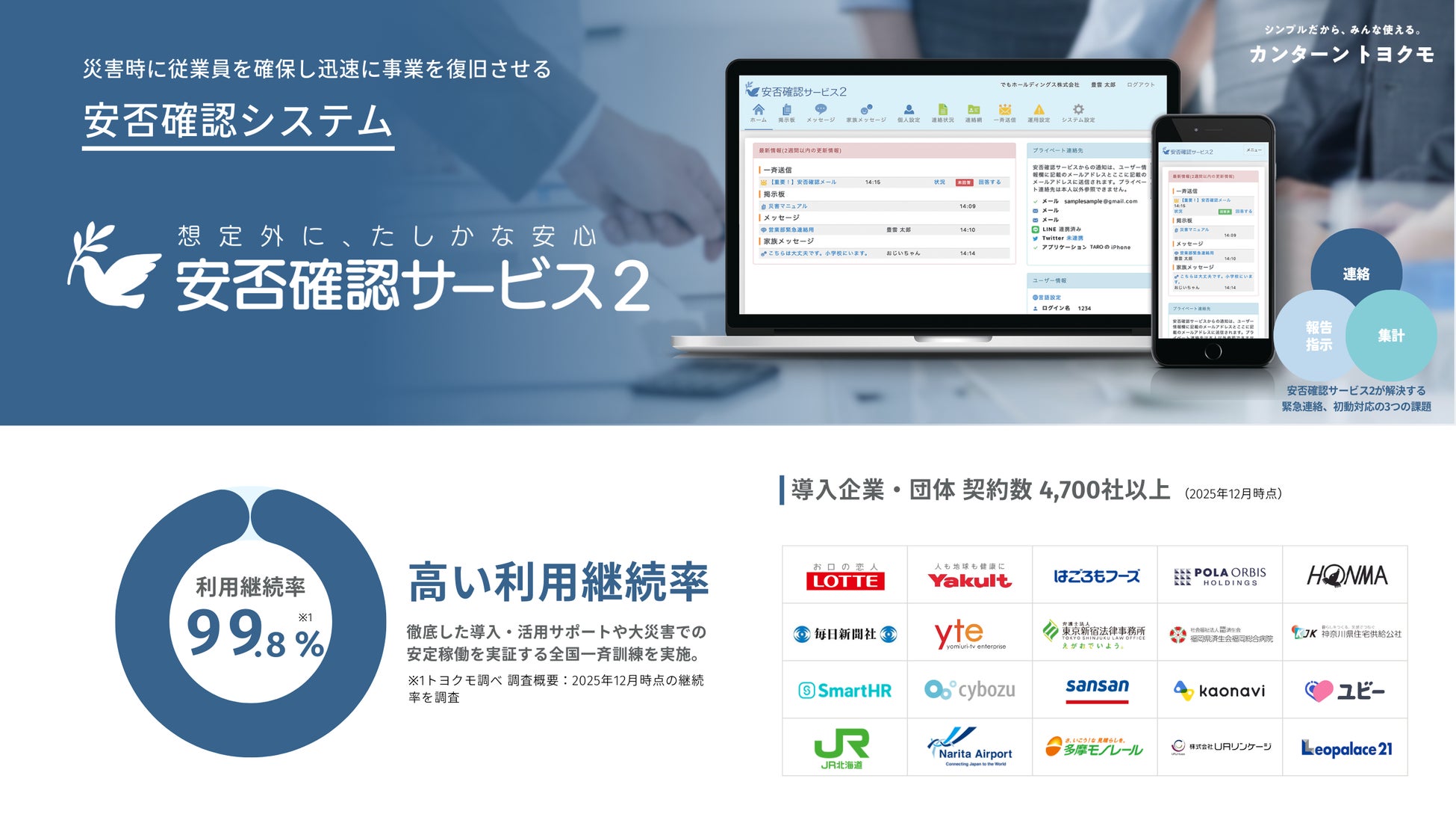 安否確認サービス2は、サービス導入社数4,700社(2025年12月末時点)の法人向けの安否確認システムです。