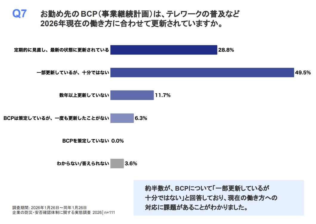 2.2026年現在の働き方に合わせたBCPの更新状況について、49.5%が「一部更新しているが、十分ではない」と回答し、6.3%は「策定以来一度も更新していない」としています。【Q7】