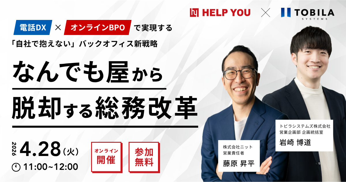 【4/28(火)オンライン開催】「なんでも屋」から脱却する総務改革 〜電話DX×オンラインBPOで実現する「自社で抱えない」バックオフィス新戦略〜
