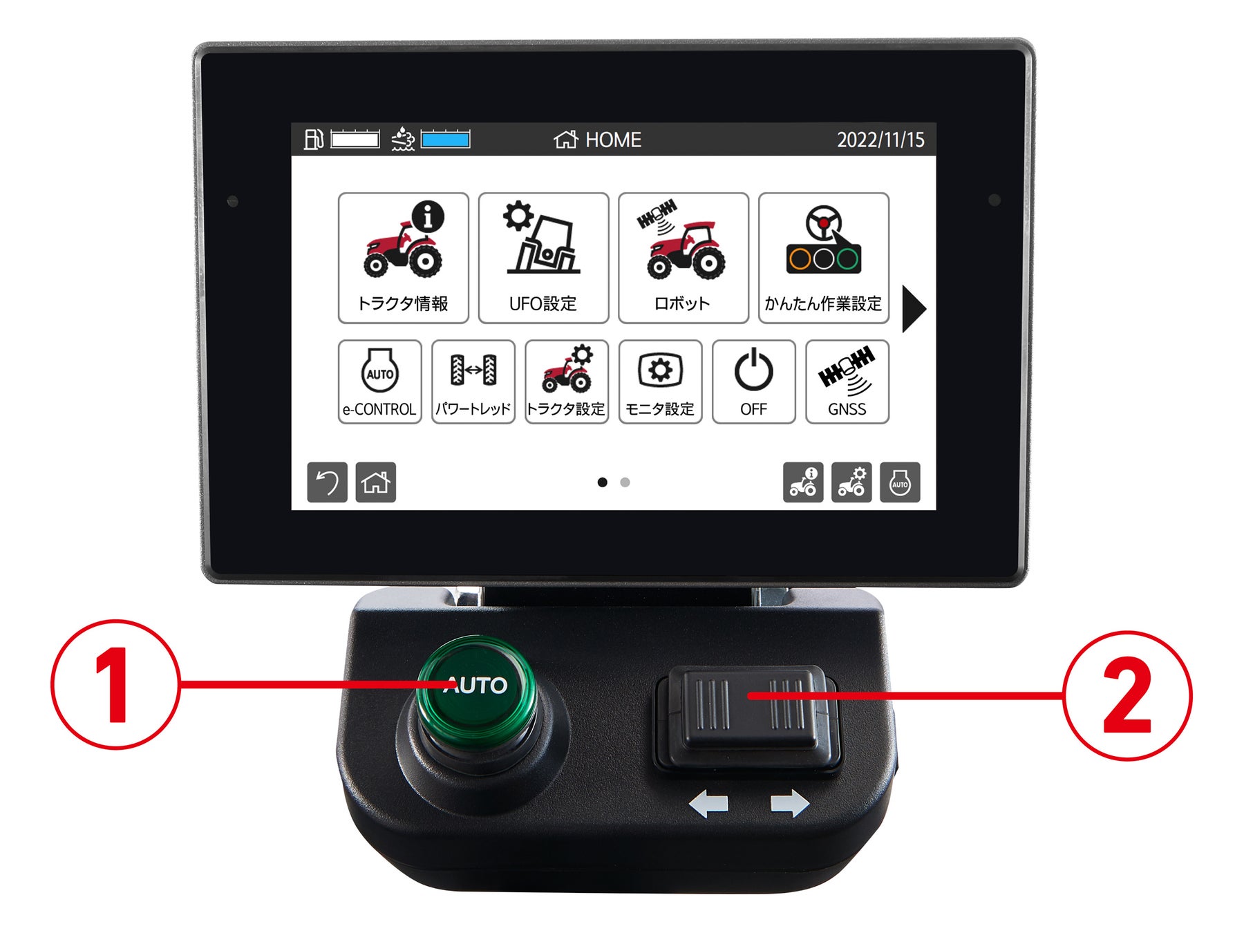 新たに設計したタッチパネル式カラーモニターは、使用頻度の高いAUTO/オフセットスイッチをモニター枠外に設置し、操作性が大幅に向上ました。AUTOスイッチ(左写真内1)でオートトラクターモード/直進モードの開始・終了を簡単に操作することができます。作業中、経路からずれている場合は、オフセットスイッチ(左写真内2)で軌道修正することができます。