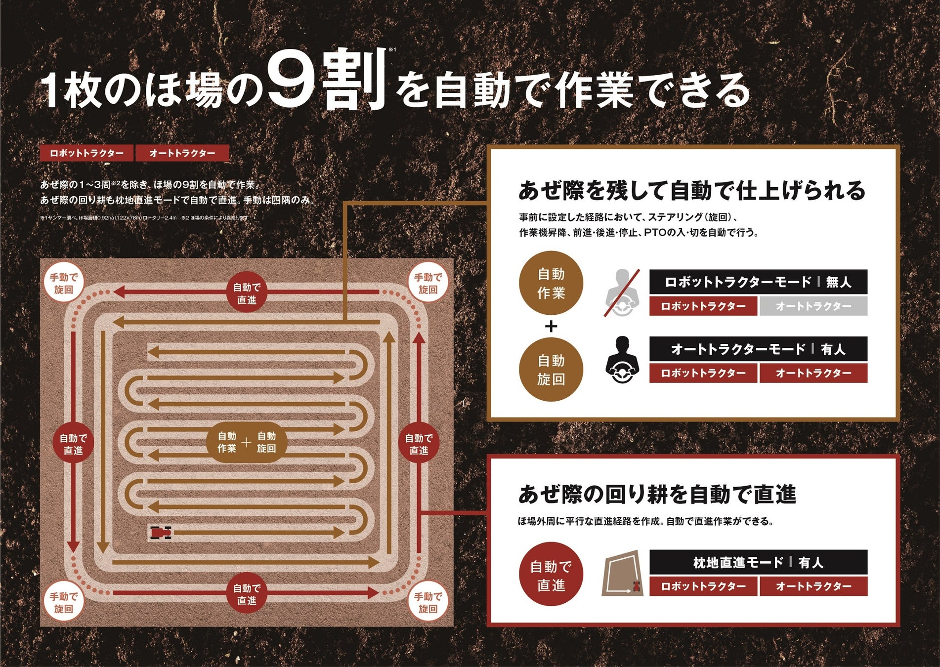 あぜ際の1~3周※2を除き、ほ場の9割を自動で作業することができ、事前に設定した経路において、ステアリング(旋回)、作業機昇降、前進・後進・停止、PTOの入・切を自動で行うことができます。また、あぜ際の回り耕も「枕地直進モード」にすることで、自動で直進することが可能です。