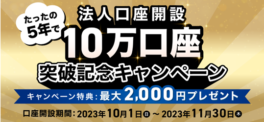10万口座突破を記念して、さらに多くの方に当社法人口座の利便性をご体験いただきたく、2023年10月1日(日)~11月30日(木)の期間に、新規に法人口座を開設し、口座をご利用いただくと最大2,000円をプレゼントするキャンペーンを実施します。