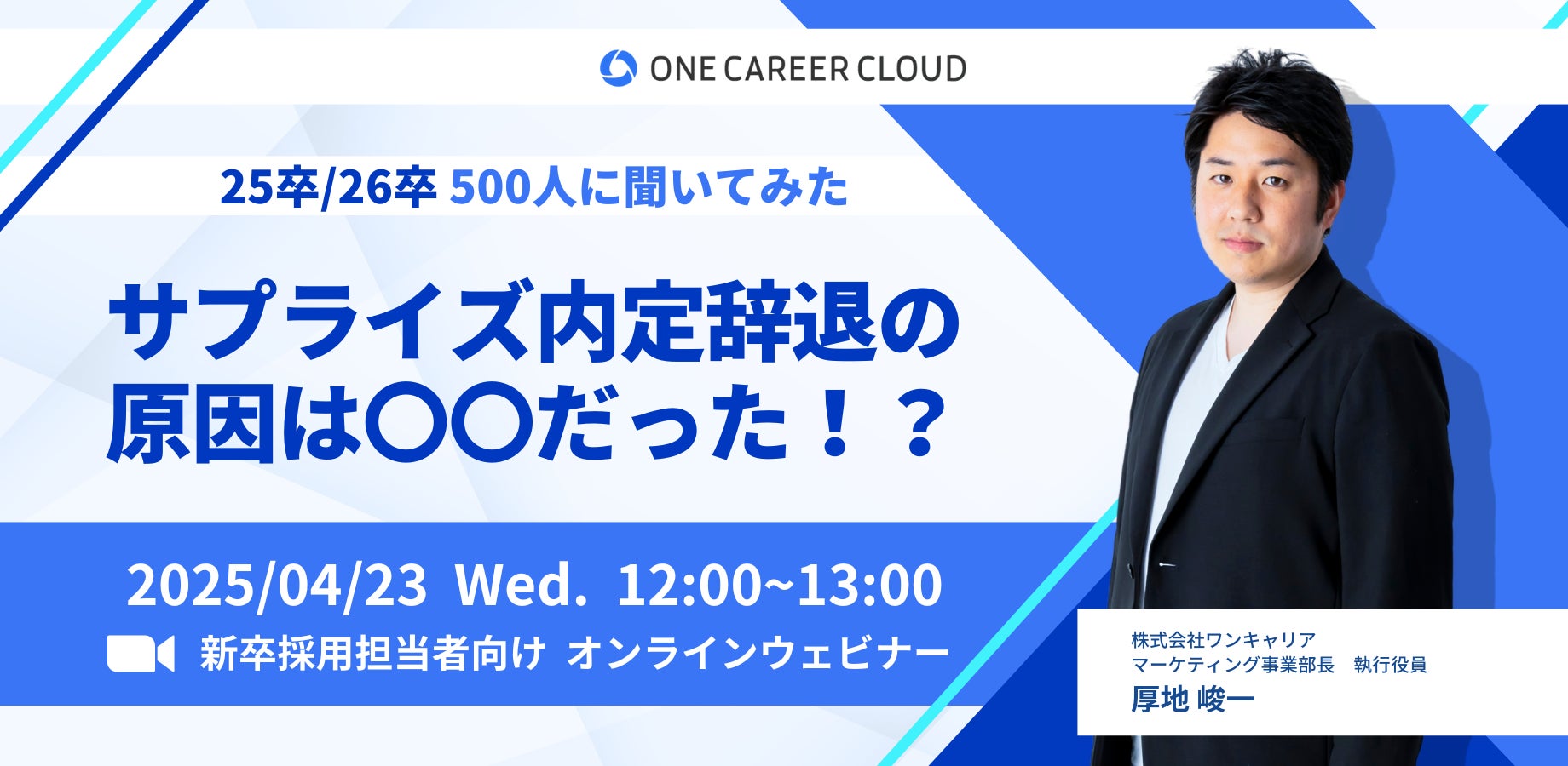 人事向け採用クラウド「ONE CAREER CLOUD」を展開する株式会社ワンキャリア(本社:東京都渋谷区、代表取締役社長 執行役員CEO:宮下 尚之、以下「ワンキャリア」)は、学生の内定辞退対策に関する新卒採用担当者向けオンラインセミナー『【25卒/26卒 500人に聞いてみた】サプライズ内定辞退の原因は〇〇だった!? 〜内定辞退を防止するための方法・学生のアトラクト戦略〜』を、4月23日(水)12時より開催します。