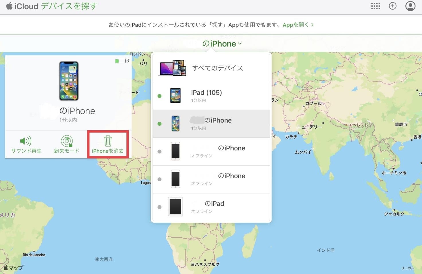 Step2:「すべてのデバイス」から、セキュリティロックアウトされているiPhoneを選択します。