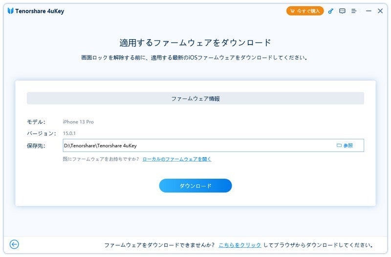Step3:最新のiOSファームウェアが自動で検出されますので、保存先を選択して「ダウンロード」をクリックします。