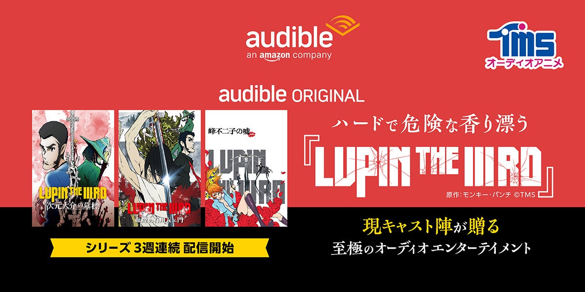 世界最大級のオーディオブックおよび音声コンテンツ制作・配信サービスであるAmazon オーディブル(以下、Audible)は、初の試みとなるオーディオアニメ『LUPIN THE ⅢRD』シリーズの3作を12月14日から順次配信開始します。本作はAudibleオリジナルポッドキャストシリーズで、モンキー・パンチの原作に漂うアダルトかつ危険なテイストの世界を引き継ぎ、若きルパンたちの邂逅や軌跡を描いたアニメ『LUPIN THE IIIRD』シリーズ(監督:小池健、脚本:高橋悠也)のシナリオをベースにAudibleのために台本を作成した至極のオーディオエンターテインメント。また、原作アニメでも音楽を担当したジェイムス下地が今作の為に楽曲を提供。そして、アニメシリーズの現キャスト陣:栗田 貫一、大塚 明夫、浪川 大輔、沢城 みゆき、山寺 宏一がそのまま登場しています。オーディオで楽しむ新しいエンターテインメント「オーディオアニメ」をぜひAudibleでお楽しみください。
