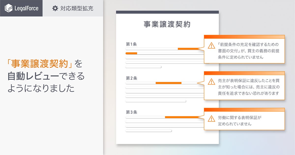 AI契約審査プラットフォーム「LegalForce」自動レビュー機能が「事業譲渡契約」に対応