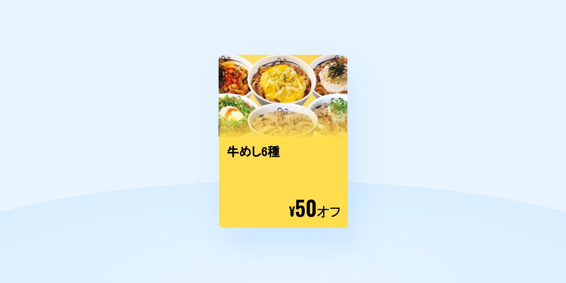 「牛めし6種 ¥50オフ」のクーポンをご利用頂けます。