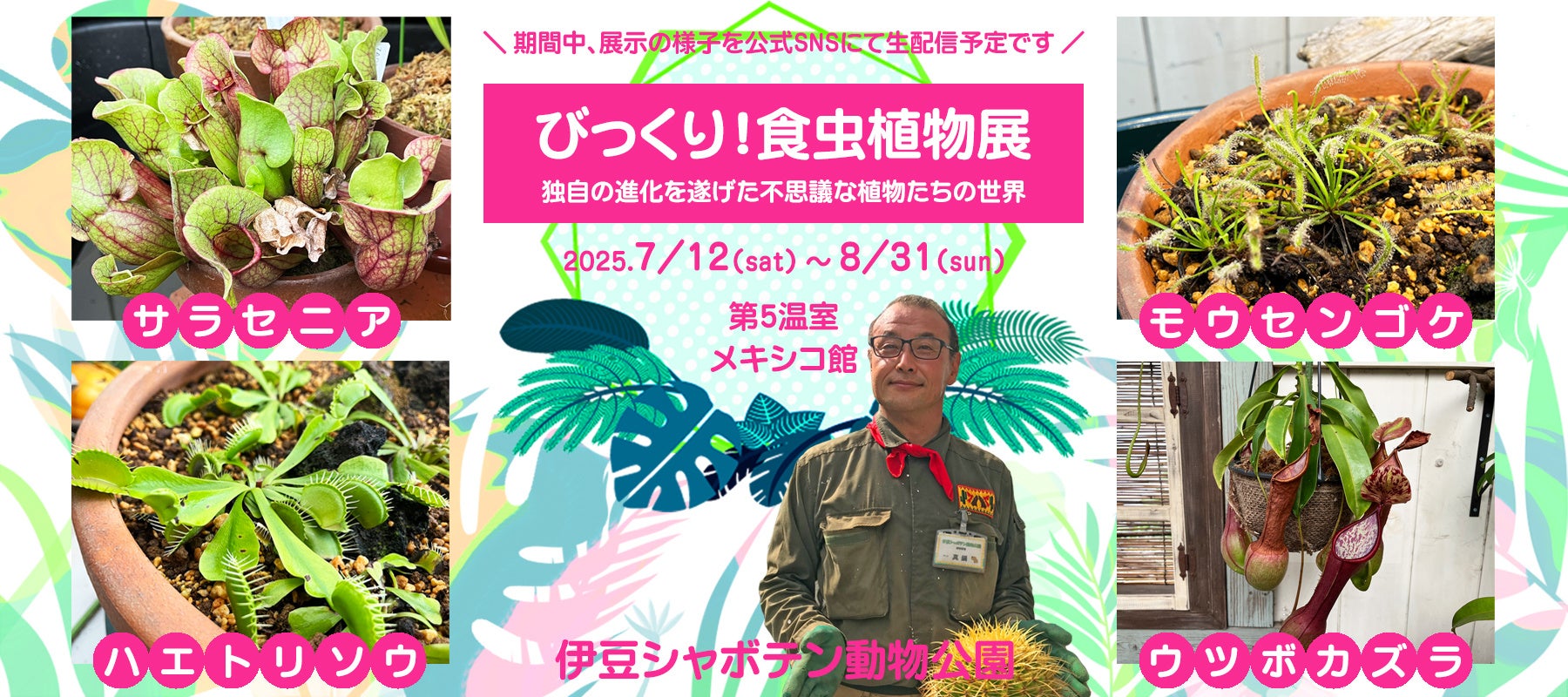 伊豆シャボテン動物公園では、2025年8月31日(日)まで、第5温室メキシコ館内において、「びっくり!食虫植物展」を開催しております。
