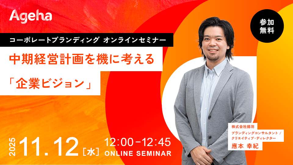 コーポレートブランディング支援を行う株式会社揚羽(東京都中央区 代表取締役社長:湊 剛宏 証券コード:9330)は、2025年11月12日(水)に「中期経営計画を機に考える『企業ビジョン』」と題したセミナーを、オンラインで開催します。セミナー詳細はコチラ