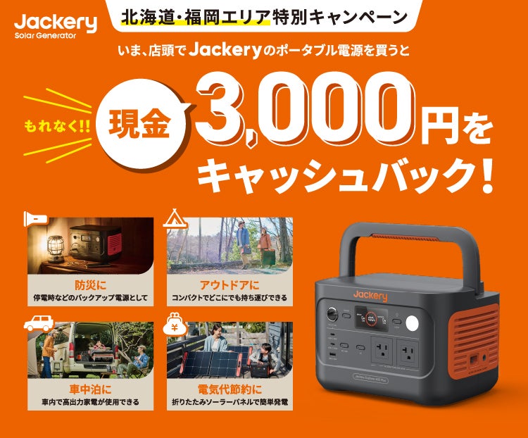 北海道・福岡県限定!Jackeryポータブル電源を400店舗以上の対象店舗で購入するともれなく現金3,000円キャッシュバックキャンペーンを開催!
