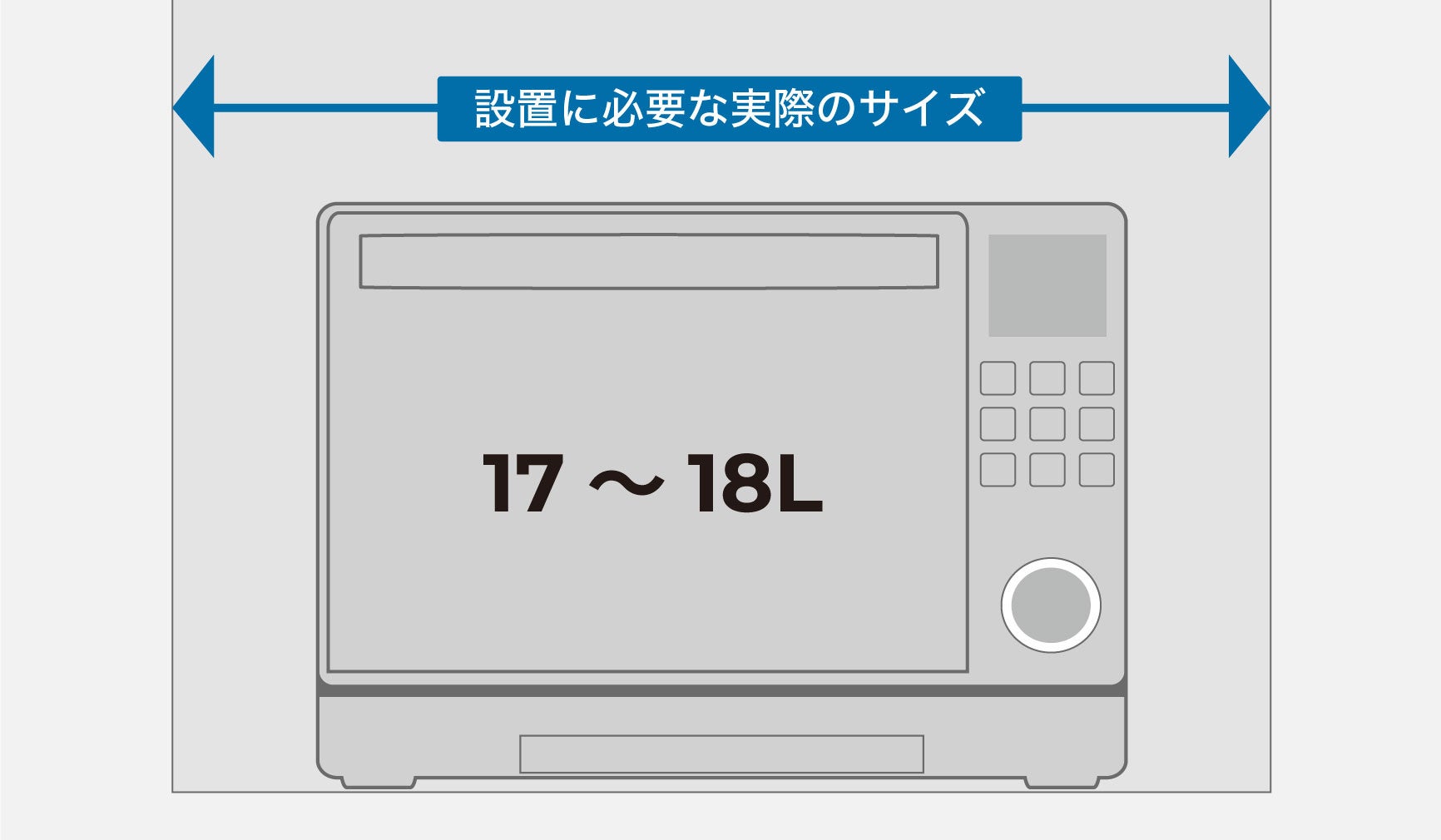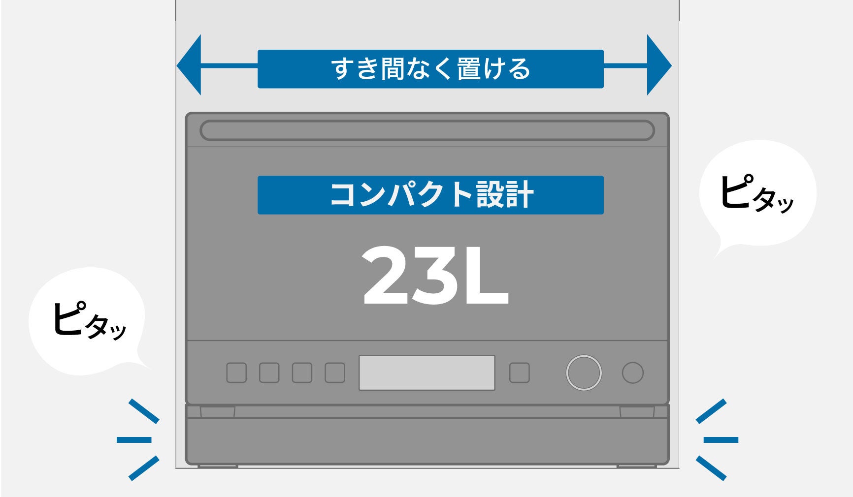 ▼左右・背面に隙間なく置けるから、17~18Lクラスのオーブンレンジと同じスペースに設置可能