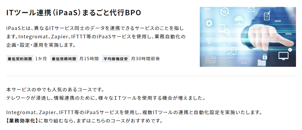 🔵「ITツール連携(iPaaS)まるごと代行BPO」の詳細はこちら