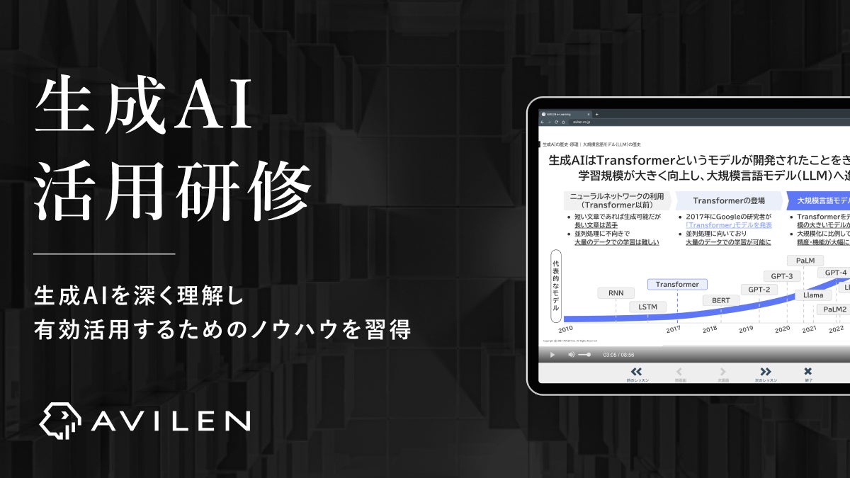 株式会社AVILEN(本社:東京都中央区、代表取締役:高橋 光太郎、以下「AVILEN」)は、生成AIの有効活用に必要なノウハウを習得できる講座「生成AI活用研修」をリリースしました。