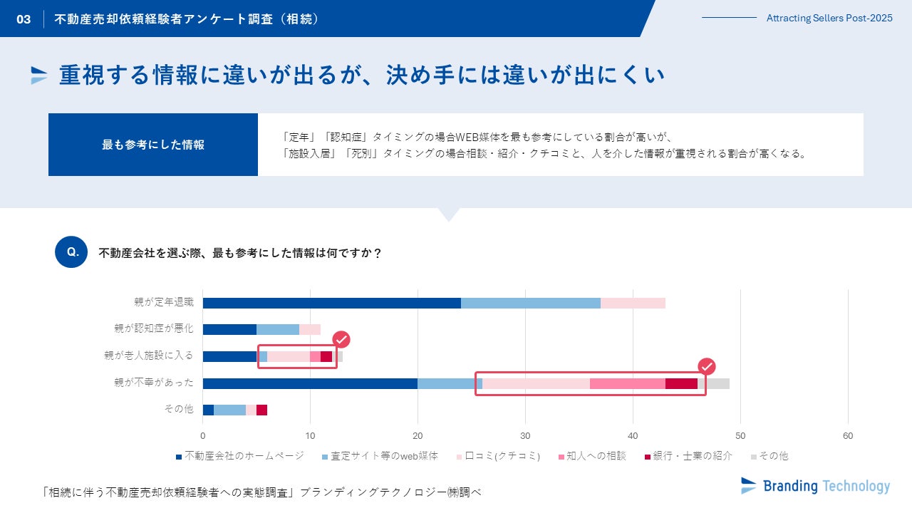 ・「死別」のタイミングで売却を考える層はWEB情報の利用が限定的であり、相談や紹介を重視する割合が高くなる。