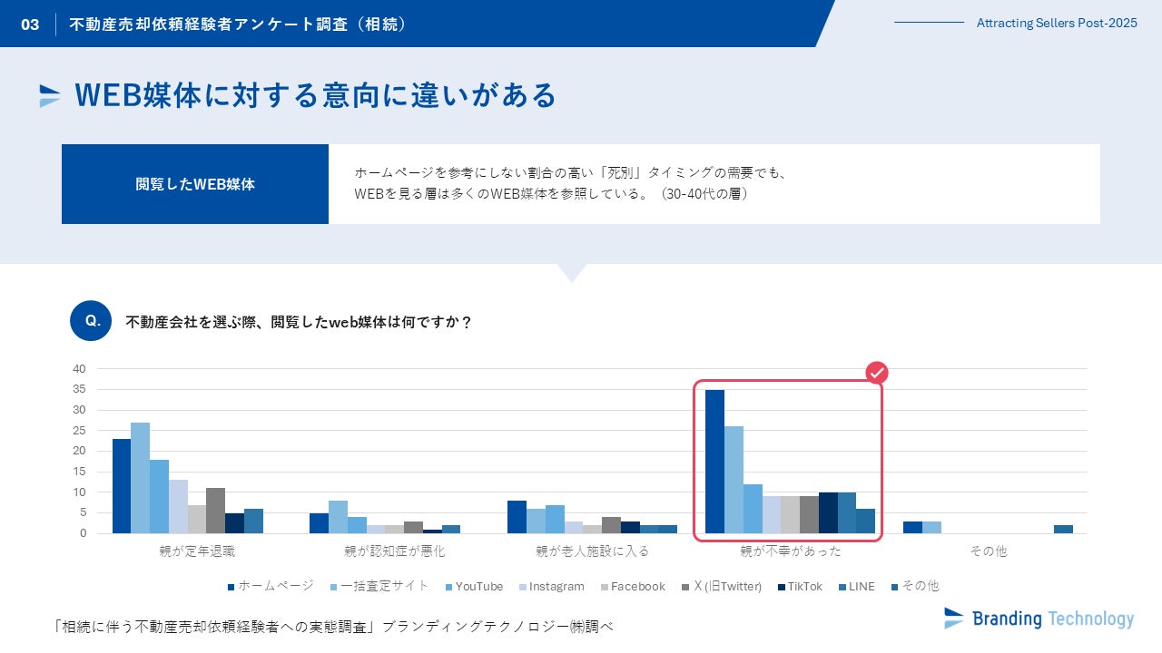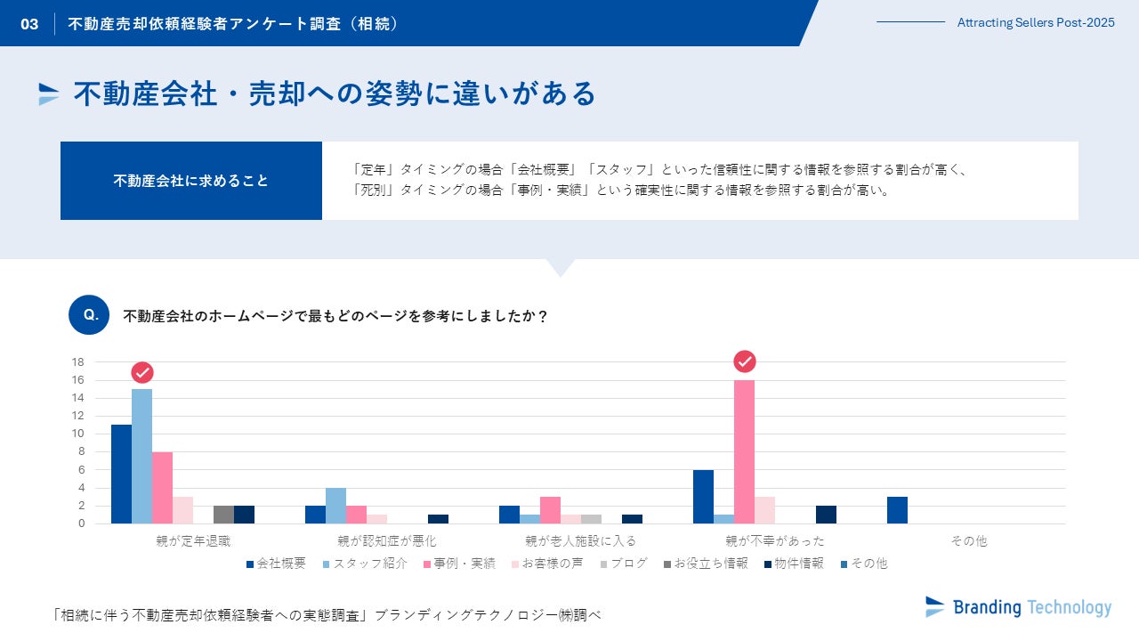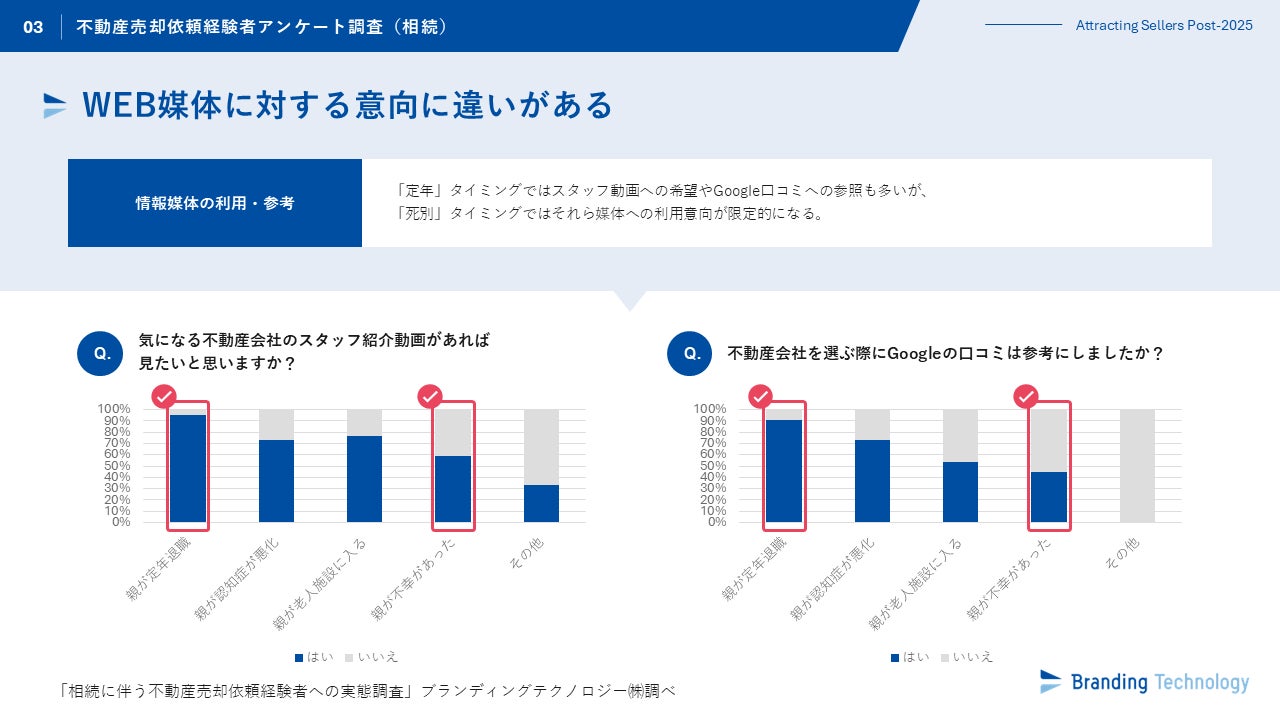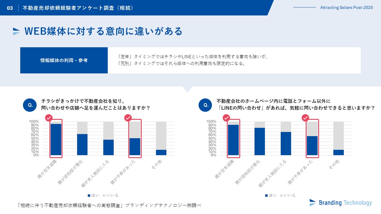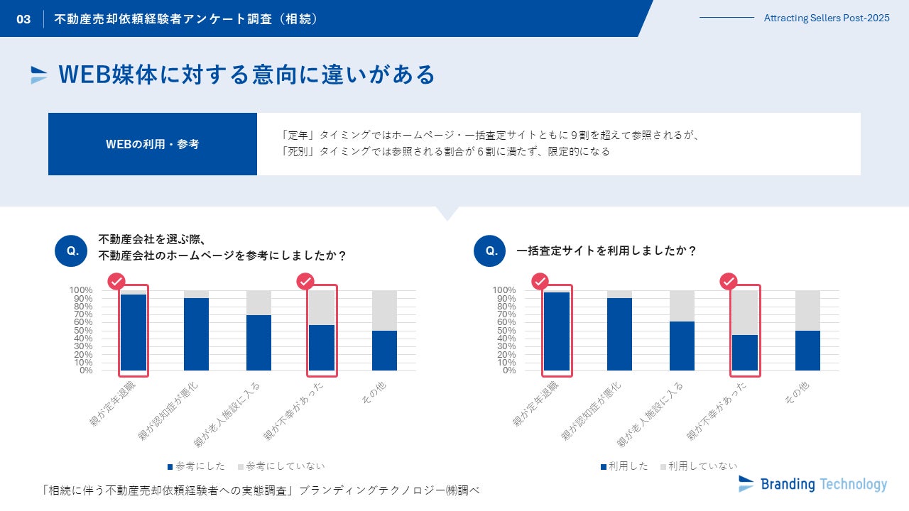 「定年」のタイミングでは、相続人の年齢が比較的若く、WEBを活用した情報収集を積極的に行い、相続した資産の活用を検討する傾向があります。一方、「死別」のタイミングでは相続人の年齢が壮年期以降となり、資産の活用よりも確実な売却を重視する傾向が見られます。
