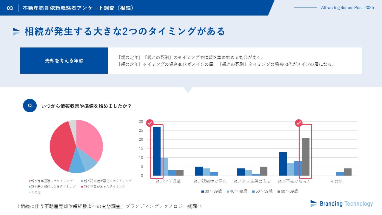 ブランディングテクノロジー株式会社(代表取締役社長:木村 裕紀、本社:東京都渋谷区、証券コード:7067)は、相続に伴う不動産売却依頼経験者の全国30代~60代の男女3,015名を対象に「相続に伴う不動産売却依頼経験者への実態調査」を実施しました。このアンケートの結果、「親の定年」「親との死別」のタイミングで不動産売却を考え始める割合が高いことが判明しました。