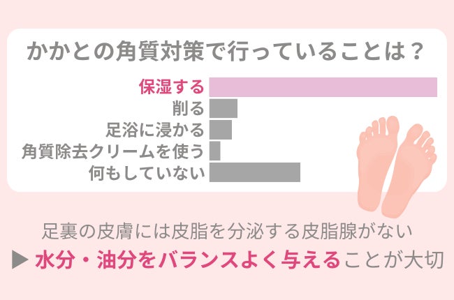 さらにかかとのひび割れで悩んだことがある方に調査したところ、最も多くの方が「保湿する」ことでかかとの角質対策を行っていることがわかりました。
