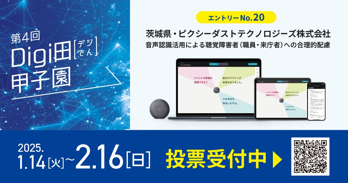 ピクシーダストテクノロジーズ株式会社(本社:東京都中央区、代表取締役会長CEO:落合陽一、代表取締役社長COO:村上泰一郎、以下「PxDT」)と茨城県は、PxDTが開発・提供するユニバーサルコミュニケーション支援デバイス「VUEVO」を活用し、聴覚障害者とのコミュニケーションの壁を解消することを目指す取り組みが、このたび「Digi田(デジでん)甲子園」の本選に出場することとなりましたので、お知らせいたします。