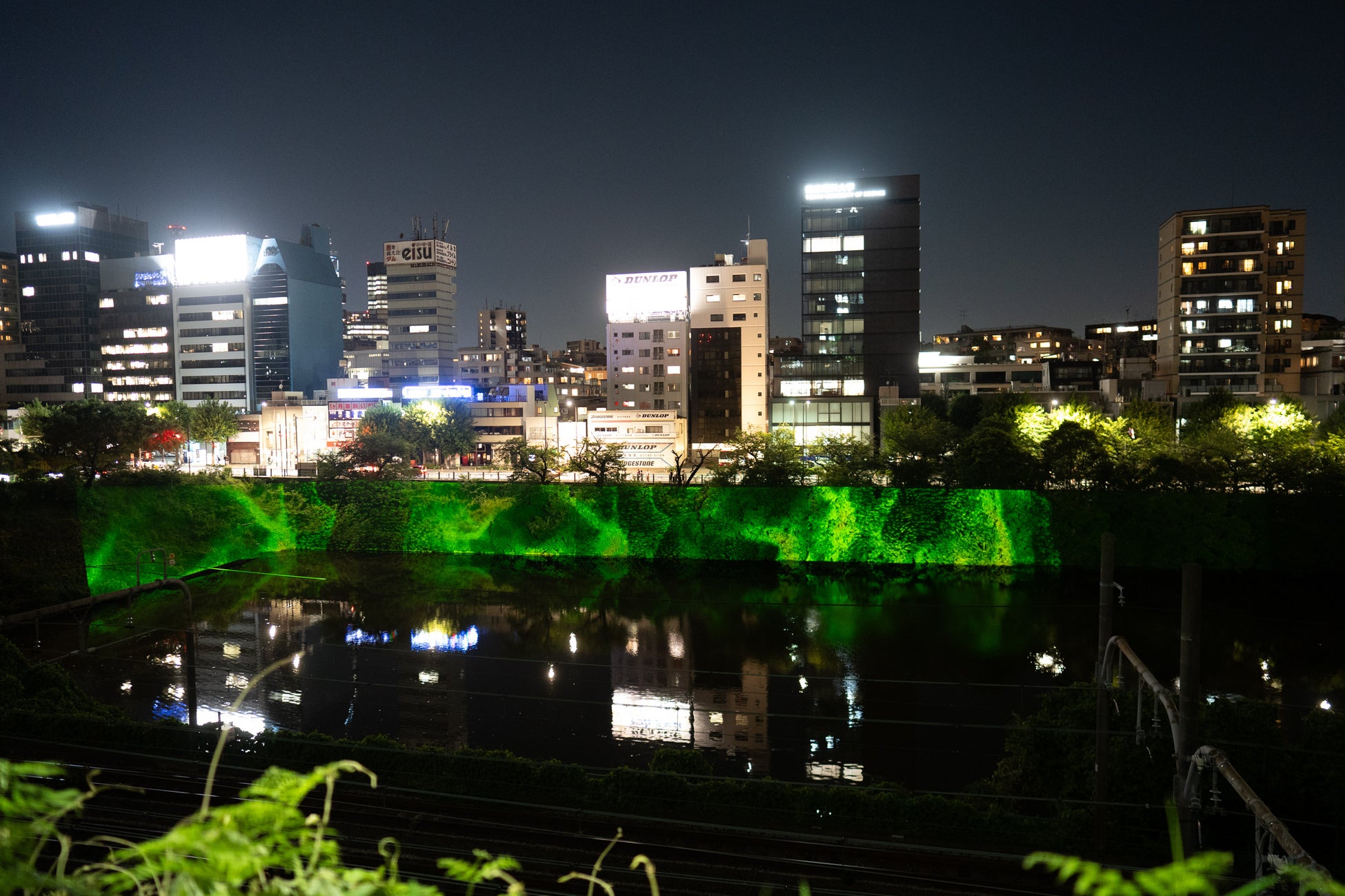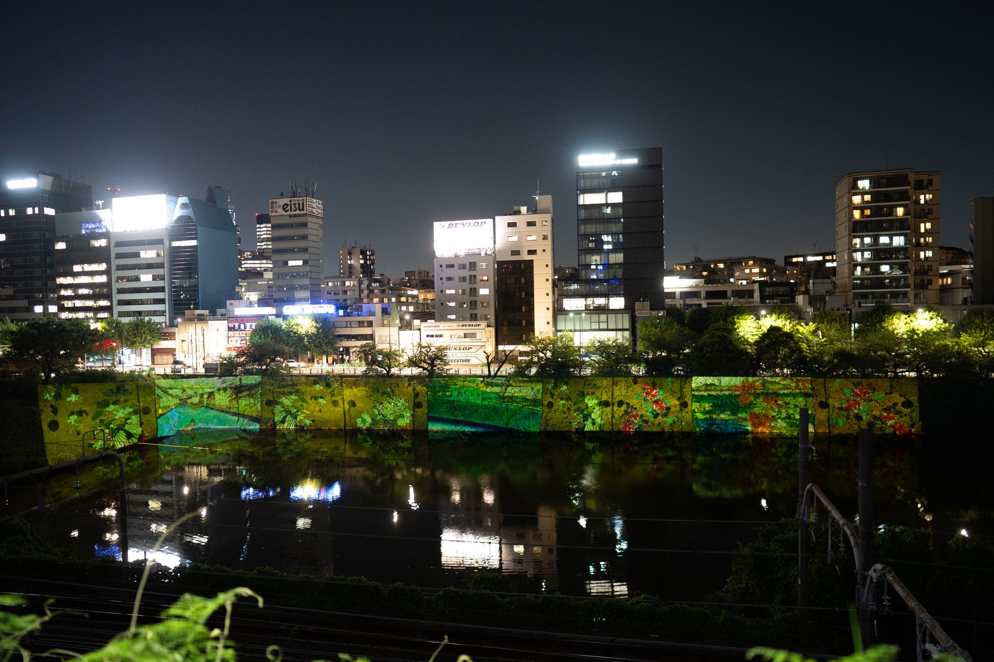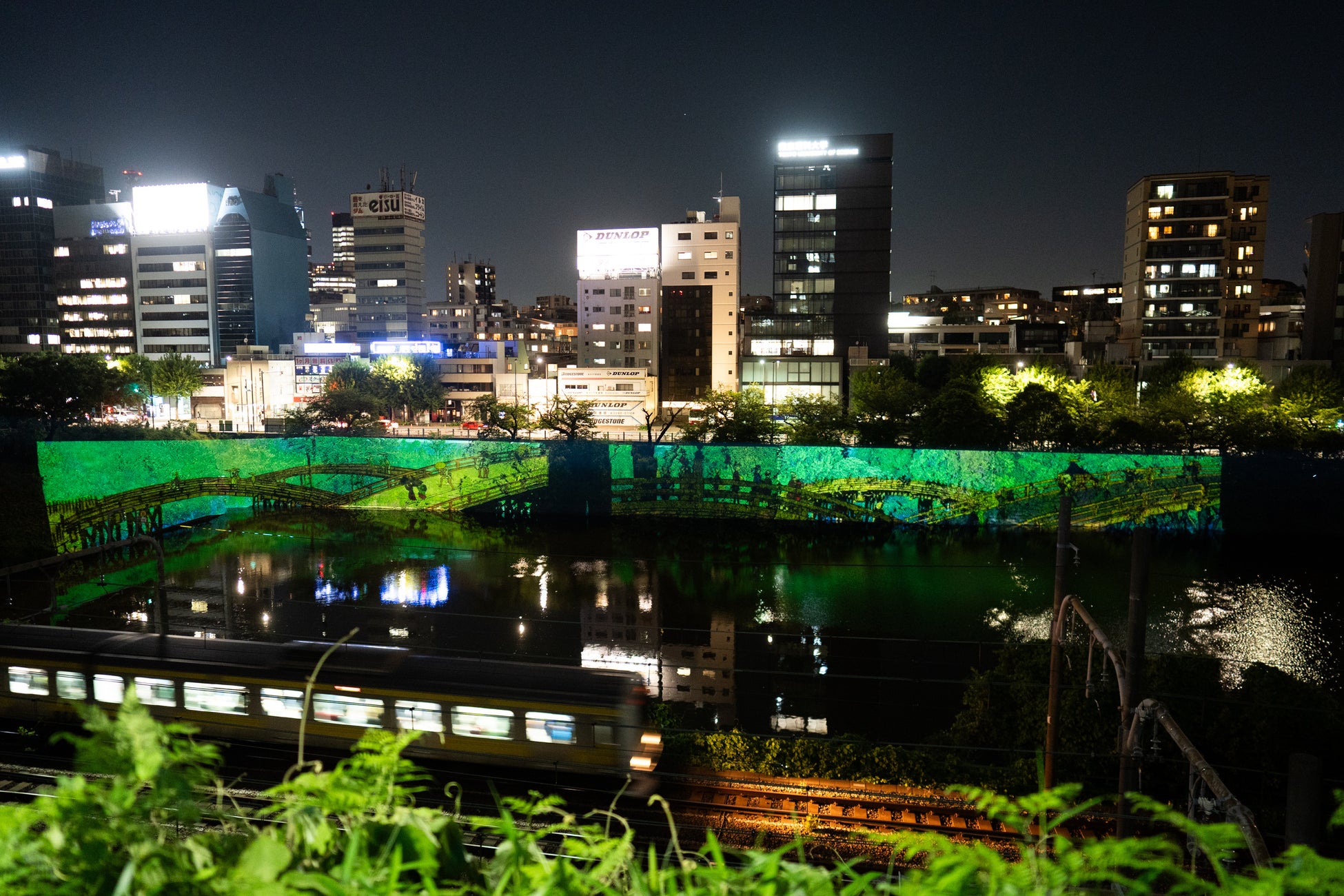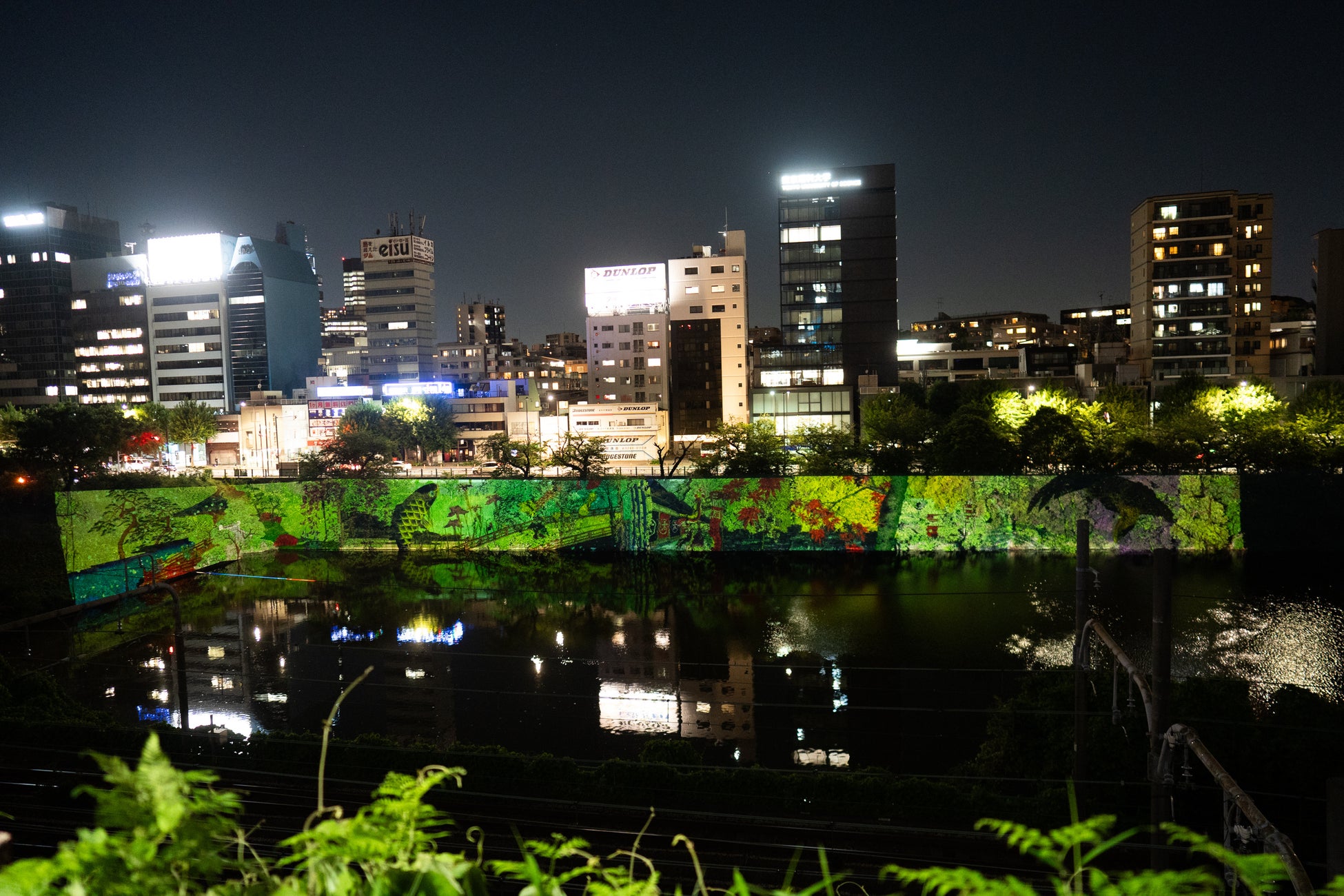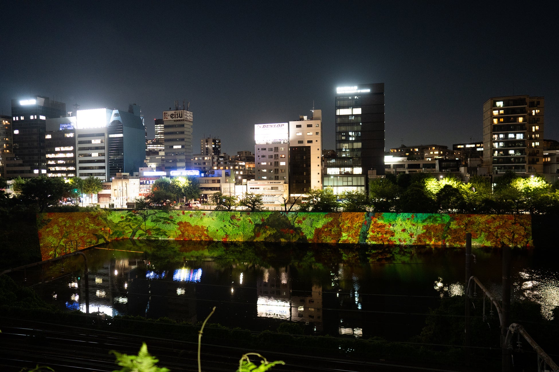 【内容】東京都の「外濠の水辺再生事業」の理解促進活動の一環として実施される実証実験で、国指定史跡江戸城外堀跡・牛込濠の法面約100mにわたって、歌川広重の「名所江戸百景」に描かれた江戸の水辺の風景をはじめ、花見や祭りで賑わう江戸のまちなどの浮世絵をモチーフにしたデジタルアニメーションのほか、水辺の再生によってよみがえる外濠をイメージした錦鯉や花々などデジタルアートによるプロジェクションマッピング映像を投影しました。