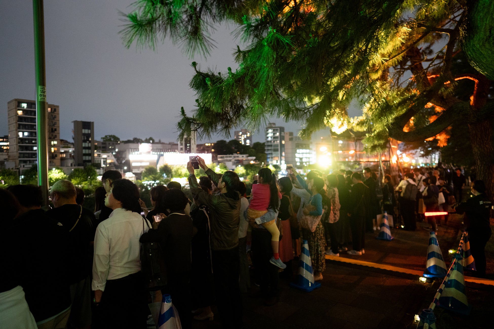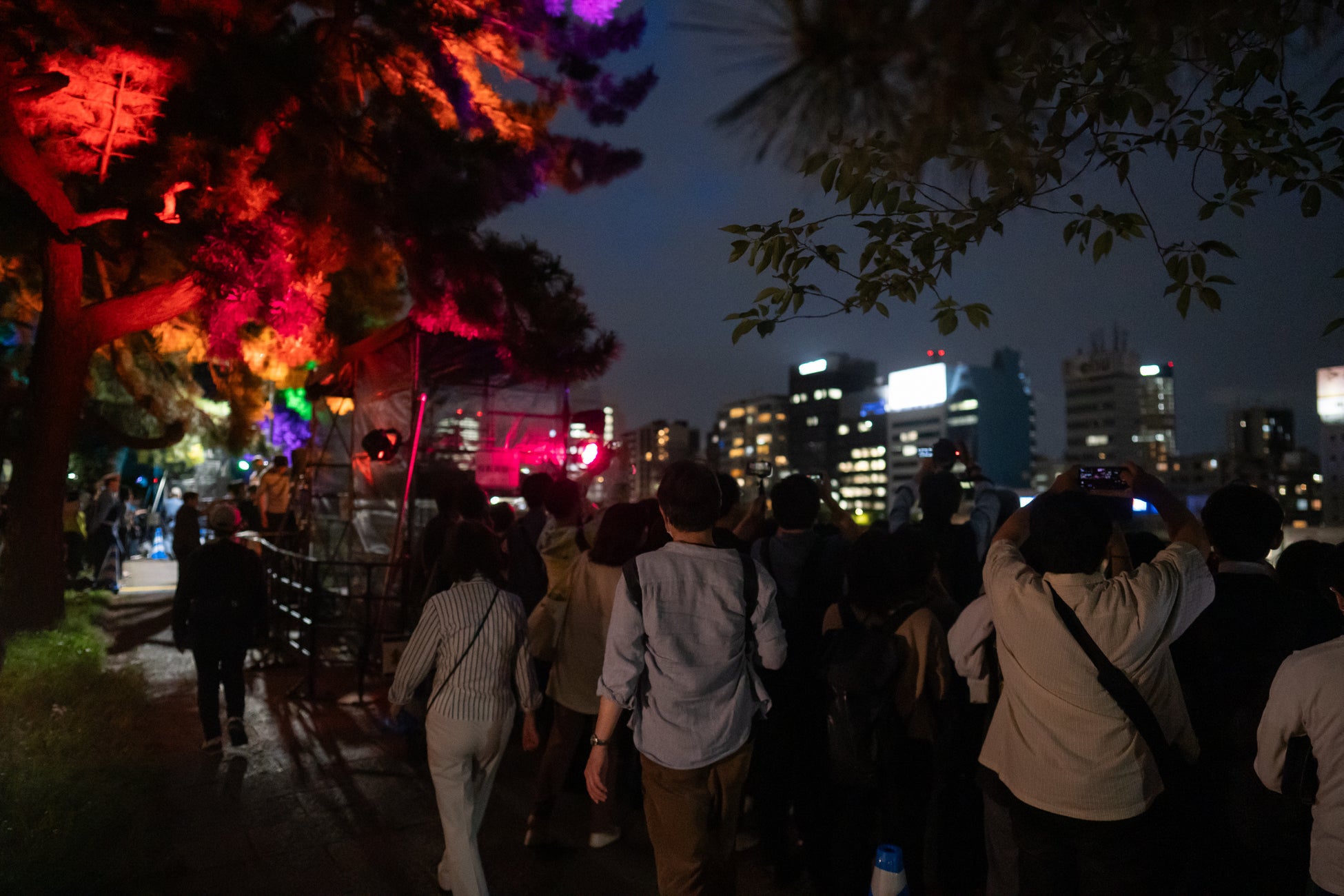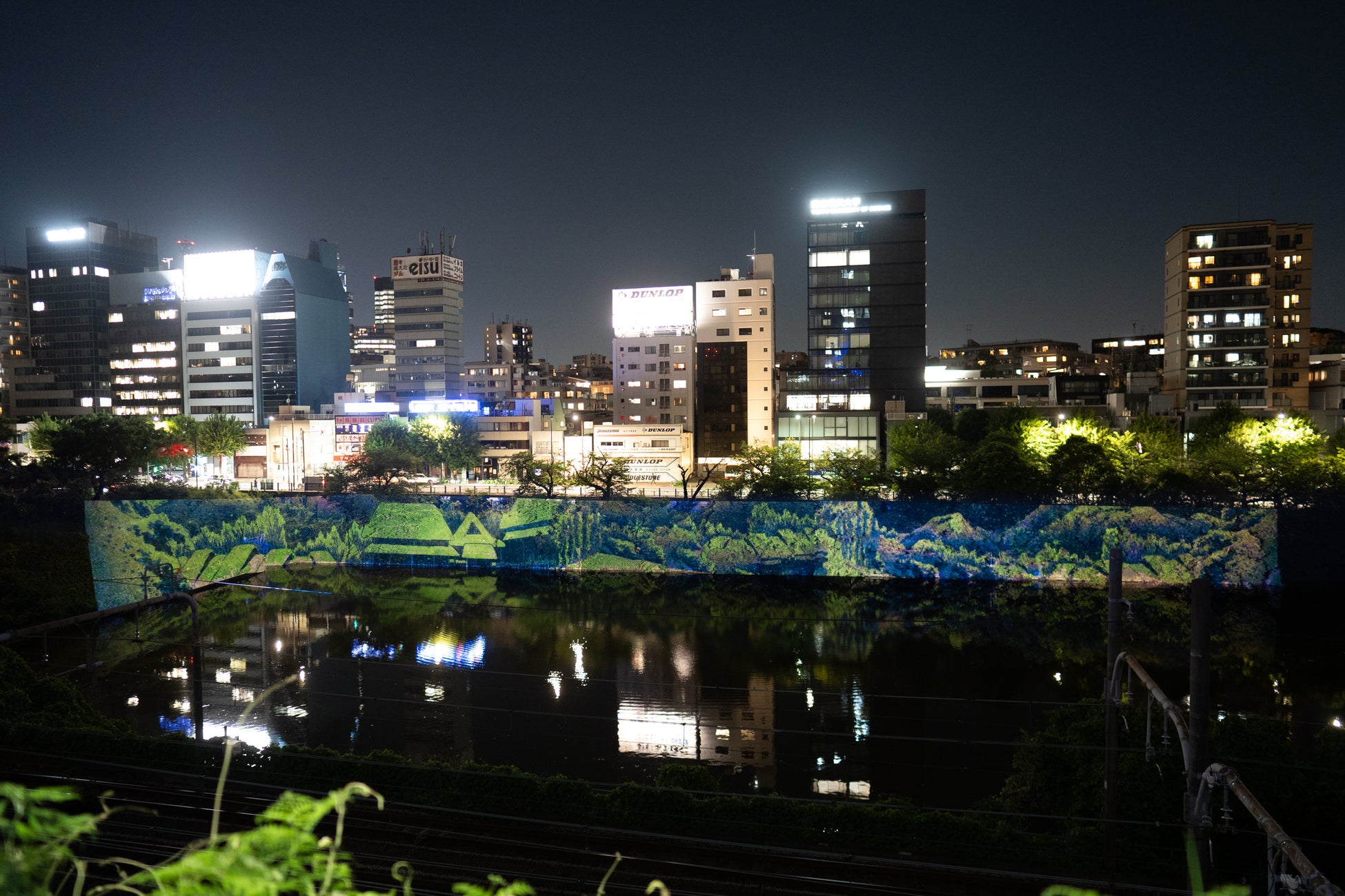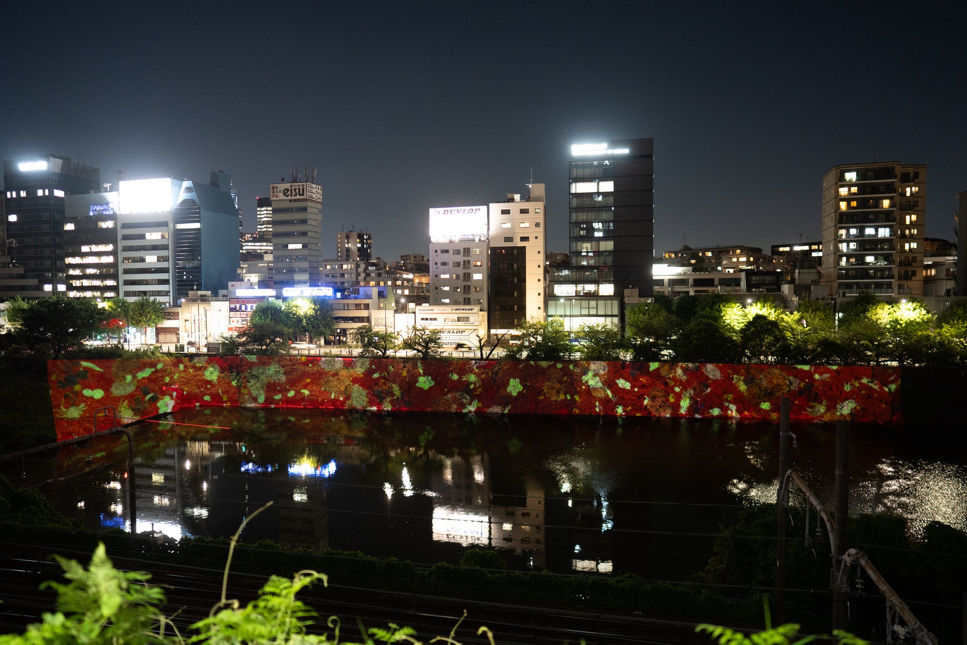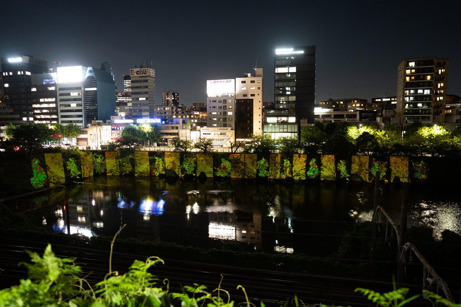 【内容】東京都の「外濠の水辺再生事業」の理解促進活動の一環として実施される実証実験で、国指定史跡江戸城外堀跡・牛込濠の法面約100mにわたって、歌川広重の「名所江戸百景」に描かれた江戸の水辺の風景をはじめ、花見や祭りで賑わう江戸のまちなどの浮世絵をモチーフにしたデジタルアニメーションのほか、水辺の再生によってよみがえる外濠をイメージした錦鯉や花々などデジタルアートによるプロジェクションマッピング映像を投影しました。