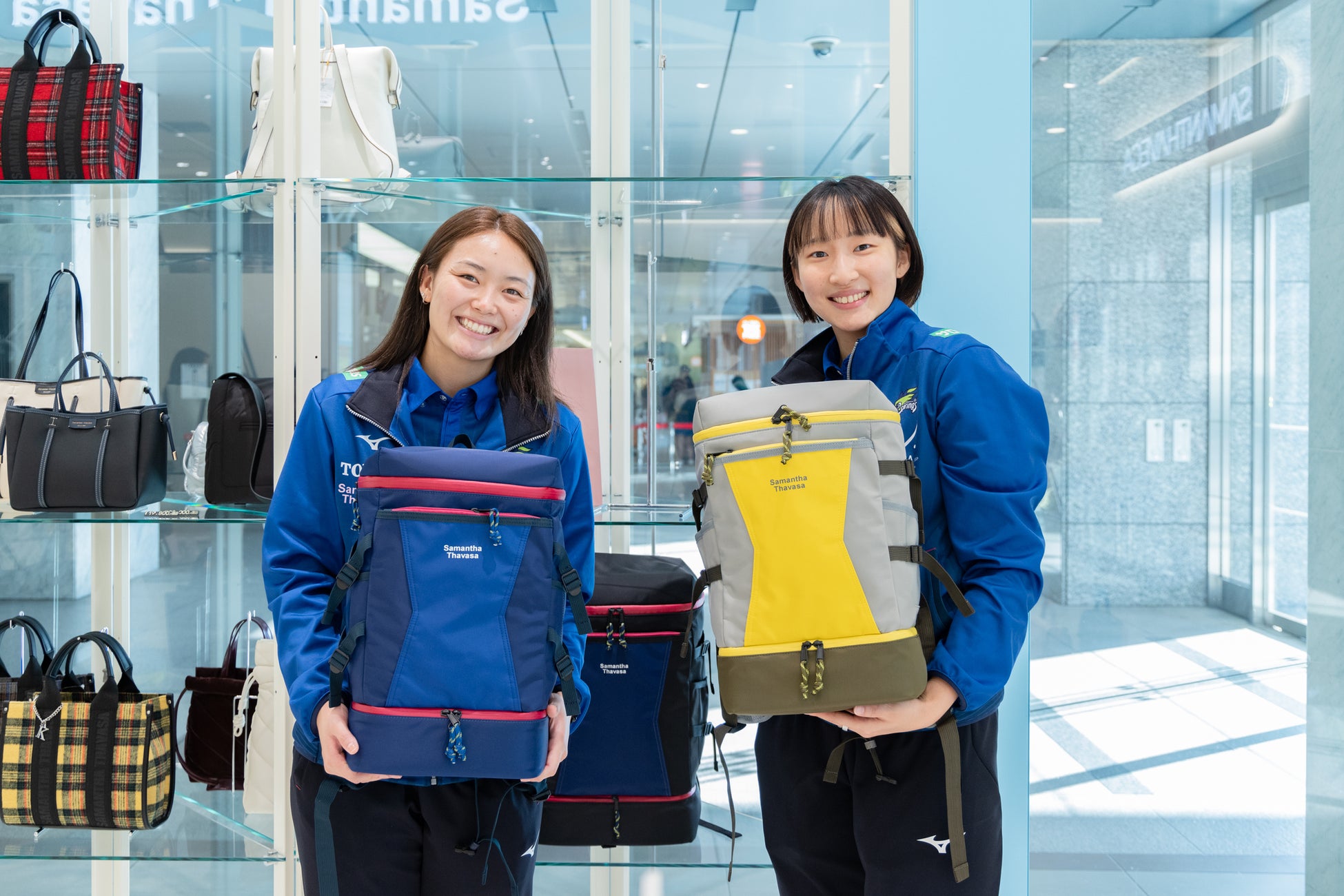 サマンサタバサと久光スプリングスのコラボリュックを手に、商品のポイントを語り合う2人。