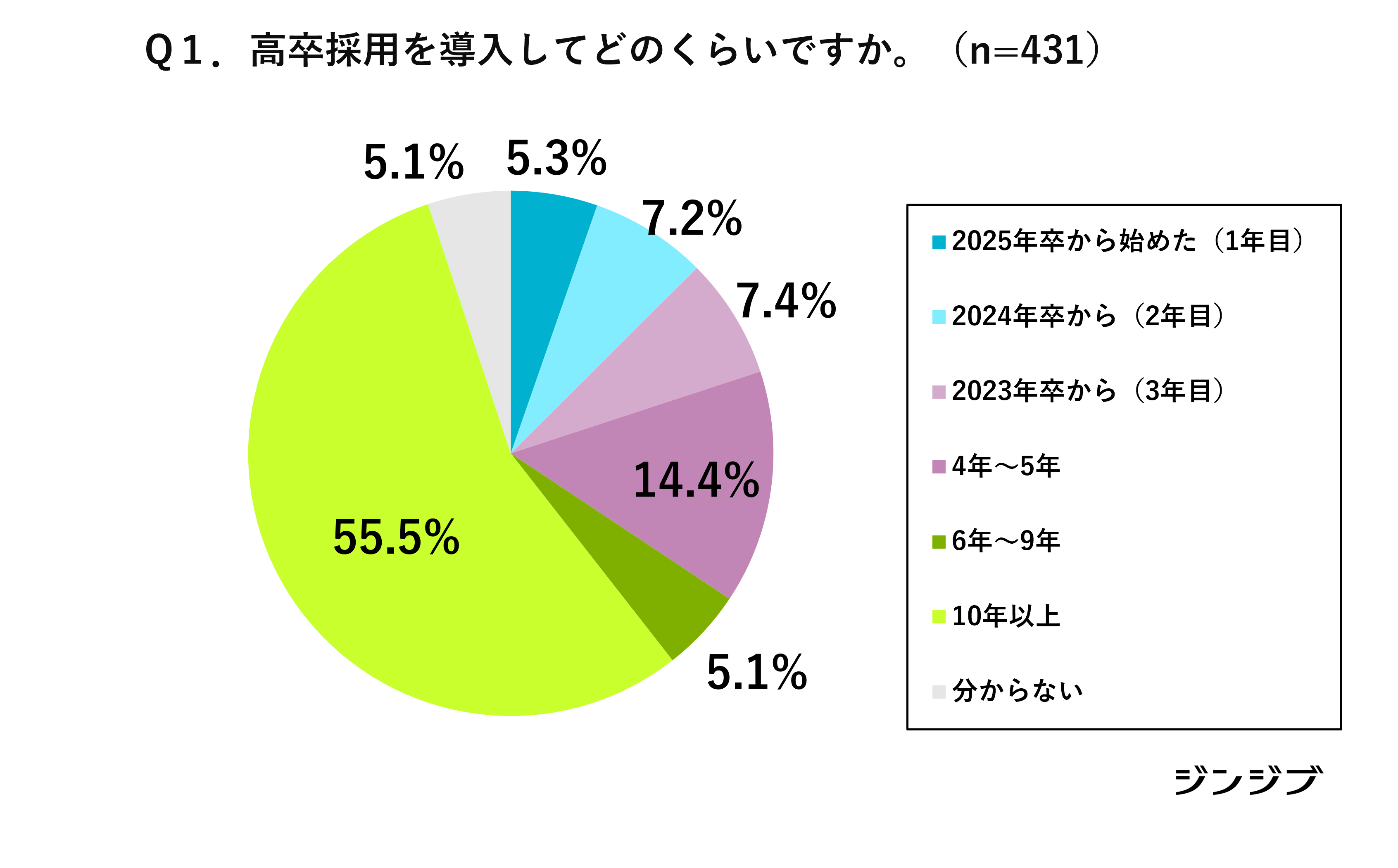 一方で、「2023年卒から」「2024年卒から」「2025年卒から」と、ここ3年以内に導入したのは19.9%で、昨年度に続いて新たに高卒採用に取り組む企業は増加傾向にあると言えます。(※)