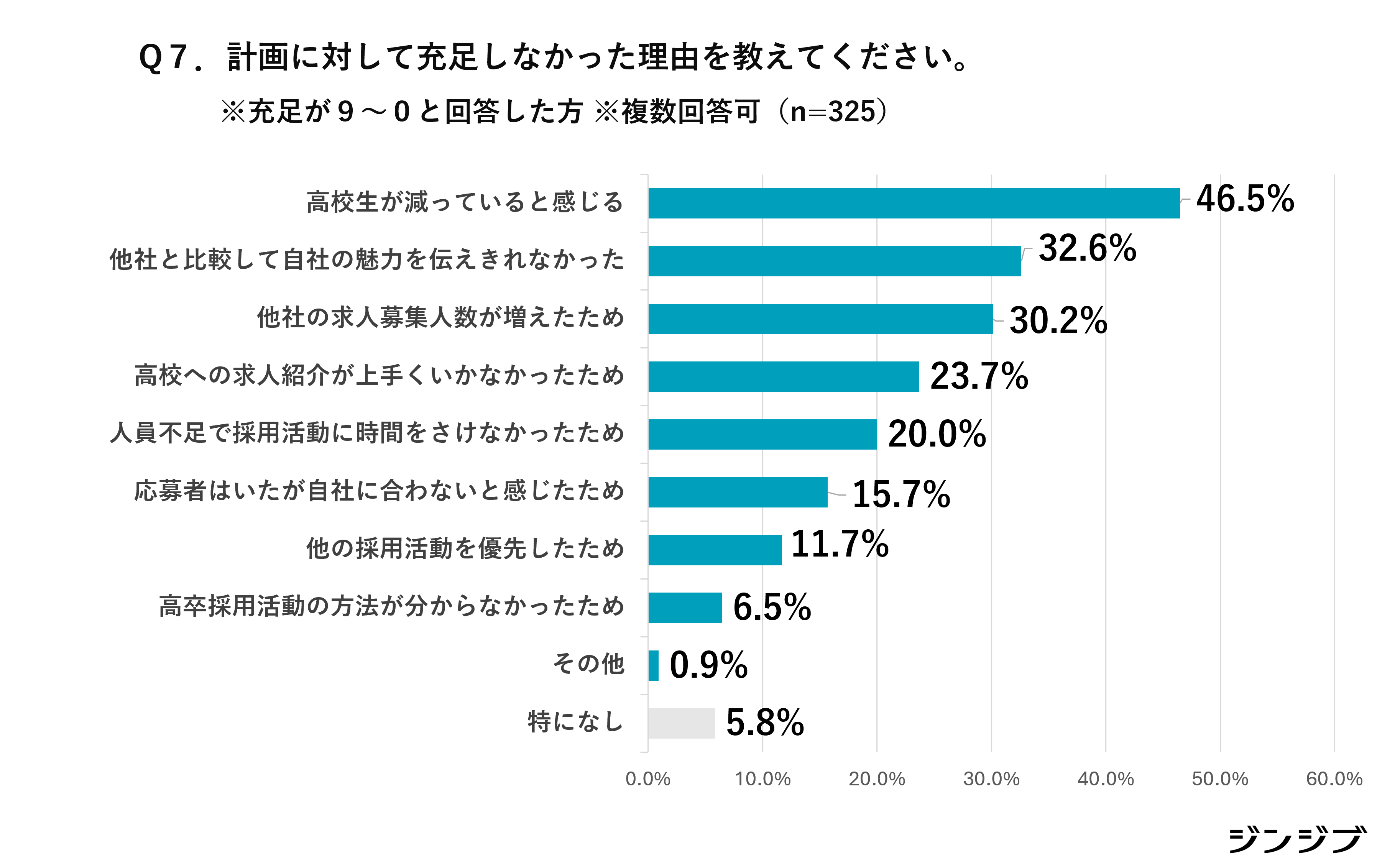 計画に対して採用が充足しなかった理由として最も多かったのは、「高校生が減っていると感じる」で46.5%に上り、少子化による母集団の縮小が大きな要因と考える人が多いです。