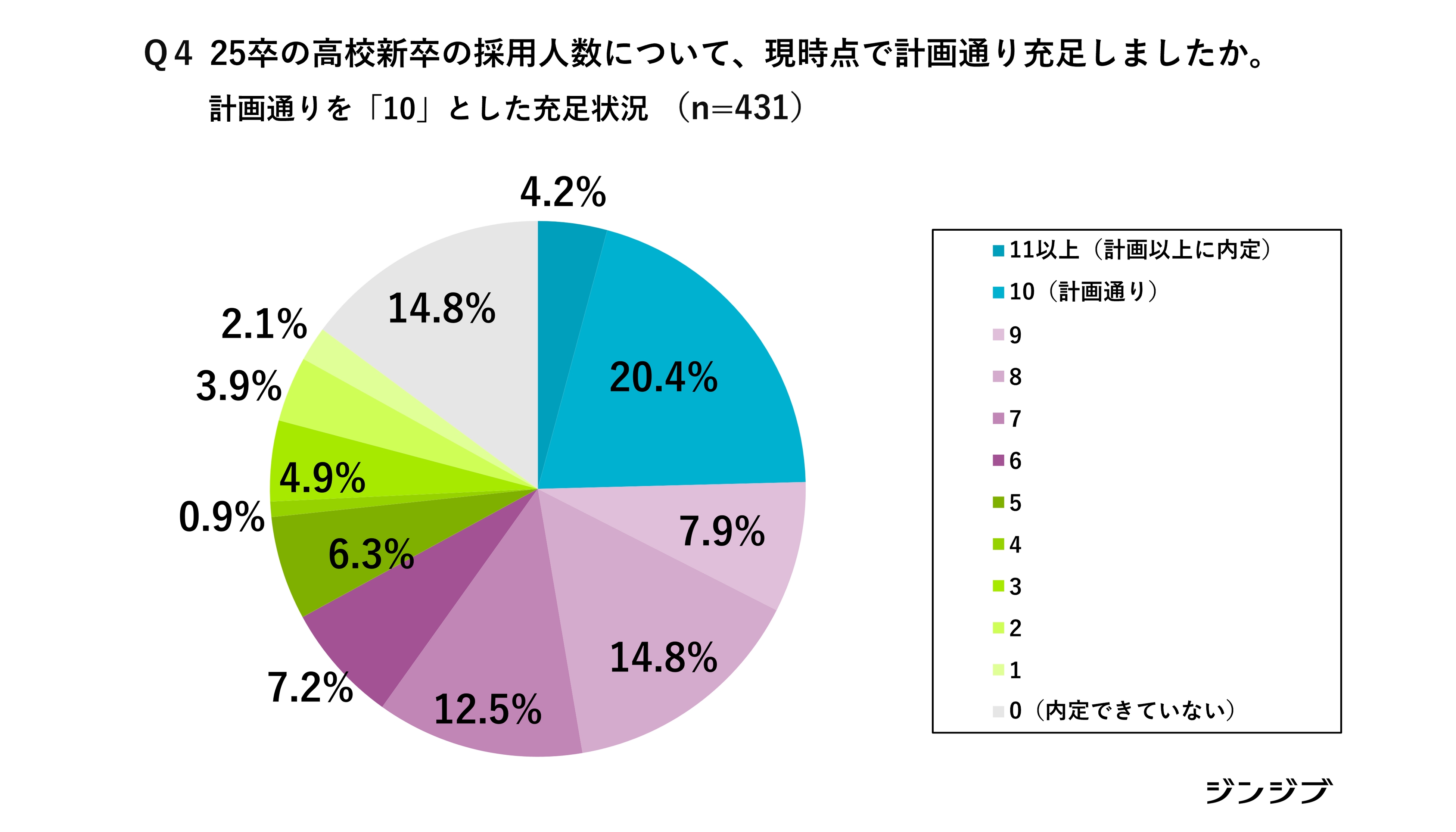 25卒の高卒採用の現在の採用結果については、「計画通りに充足した」(20.4%)、「計画以上に採用できた」(4.2%)と、全体の約4分の1近くが計画を達成または上回る結果となりました。