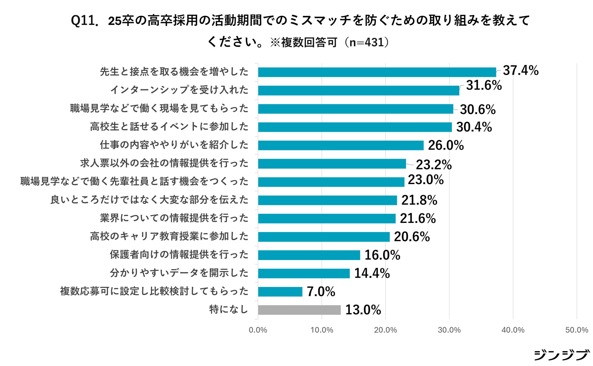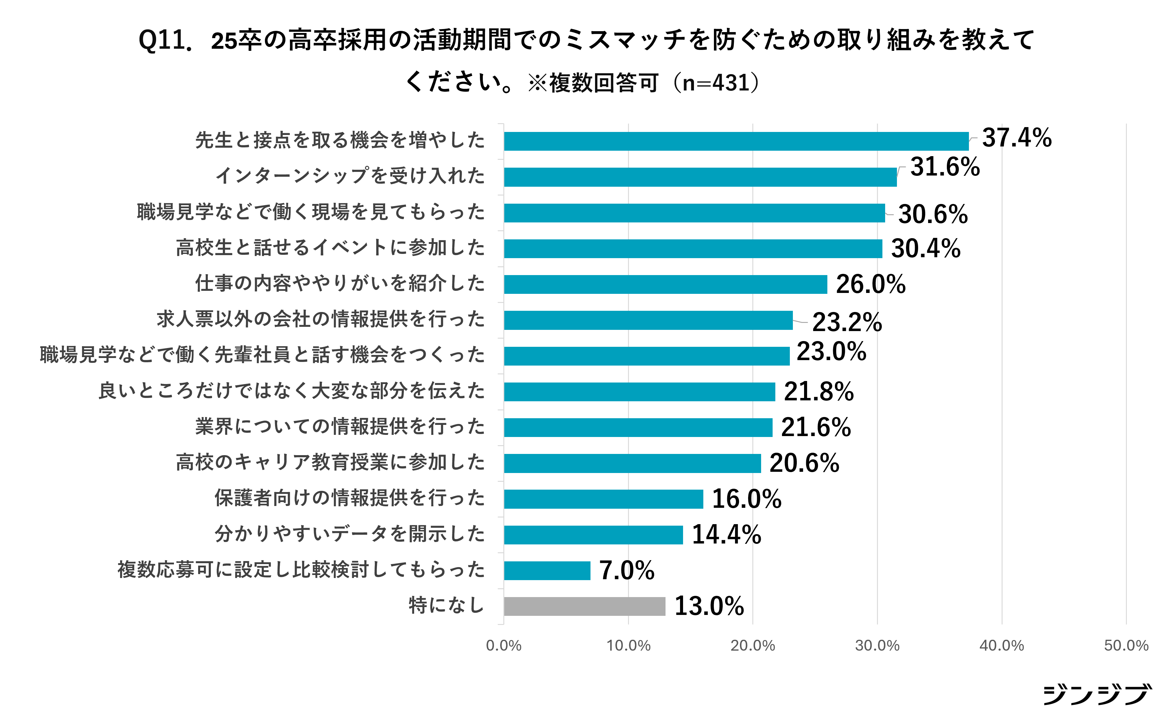 採用活動でのミスマッチを防ぐ取り組みとして最も多かったのは、「先生と接点を取る機会を増やした」(37.4%)で、高校との関係づくりを重視する姿勢がうかがえます。