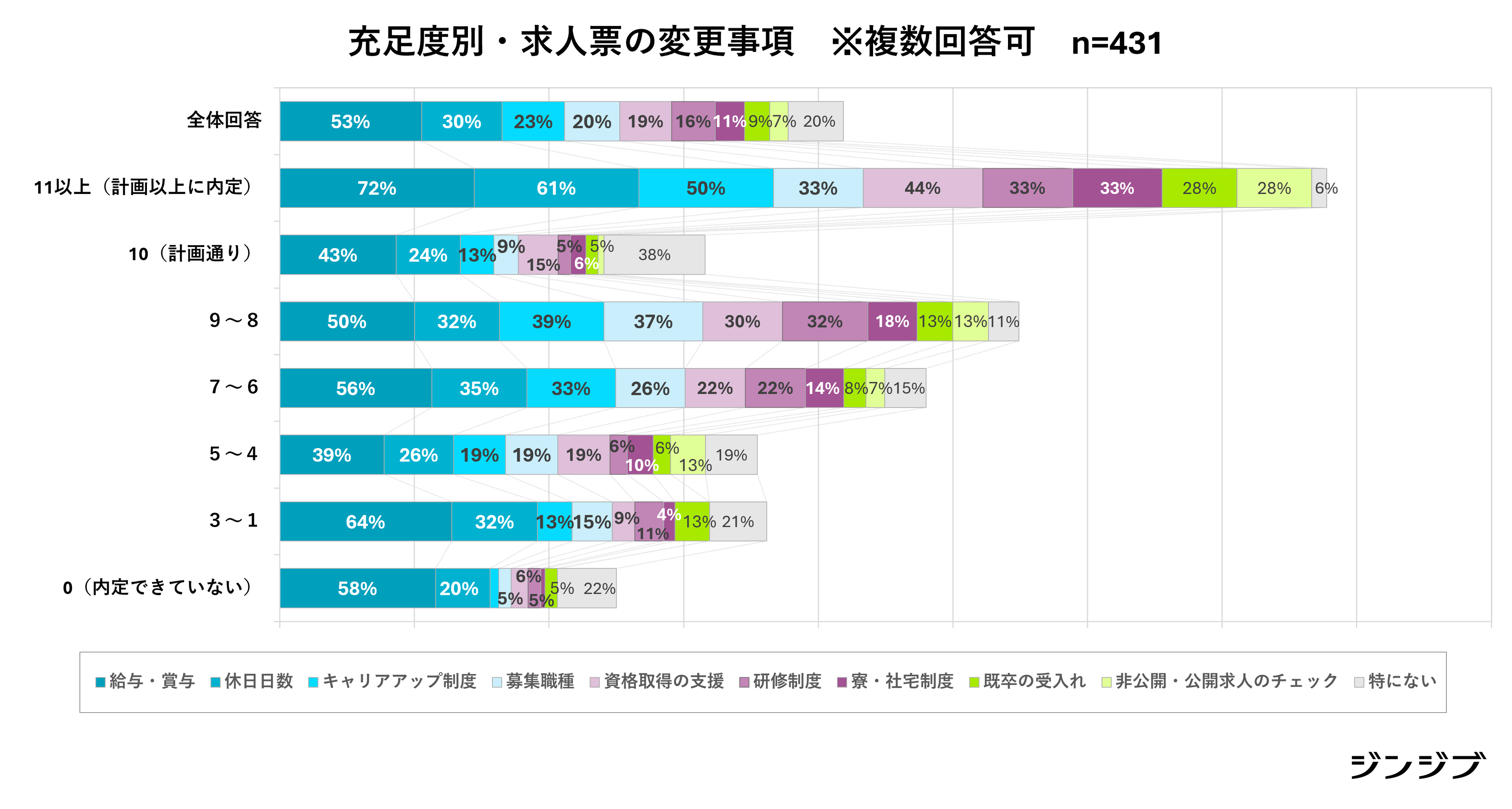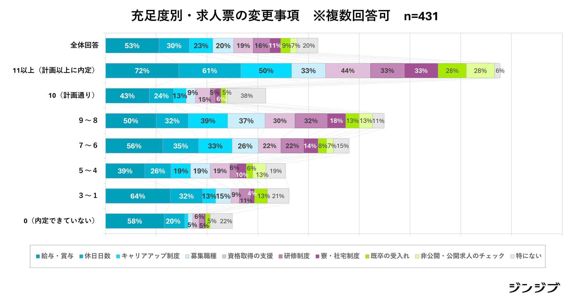 求人票の変更事項で比較すると、もっとも多かったのは「給与・賞与」でしたが、採用充足度との関係を見ると給与改善だけが成功要因ではないことがうかがえます。