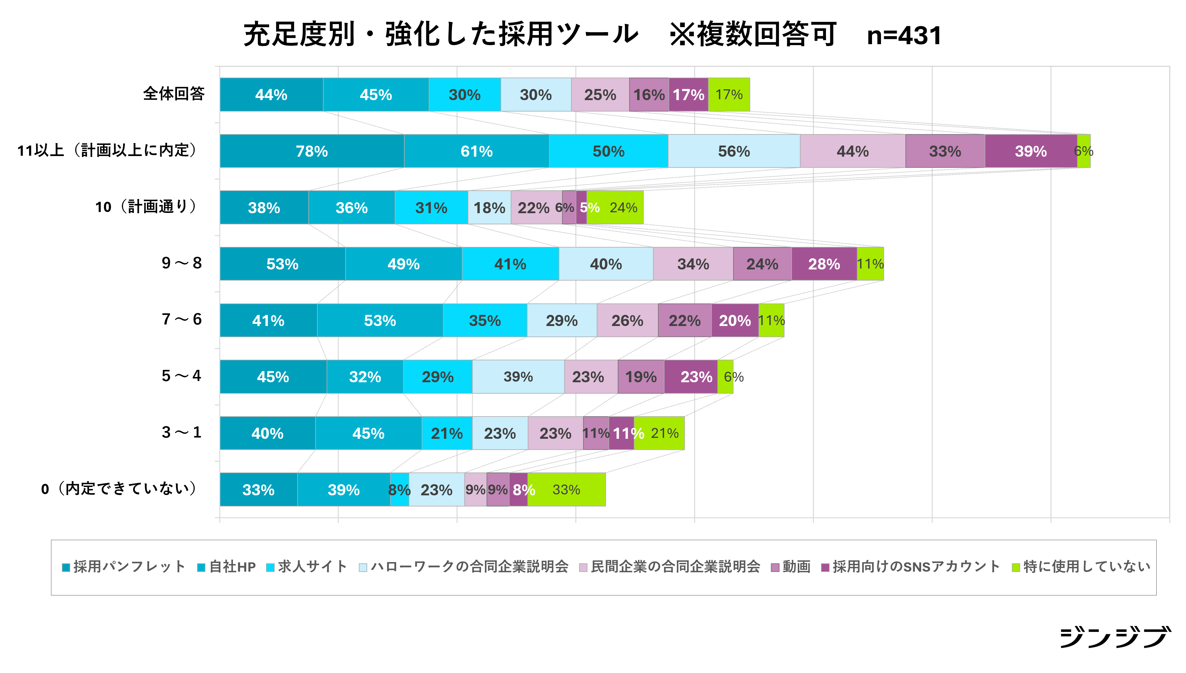 一方で採用ツールでは、「採用パンフレット」「自社サイト」「ハローワークの合同企業説明会」「求人サイト」の実施割合が多く、充足度が高まるほど採用活動や採用ツールは複数用意しています。