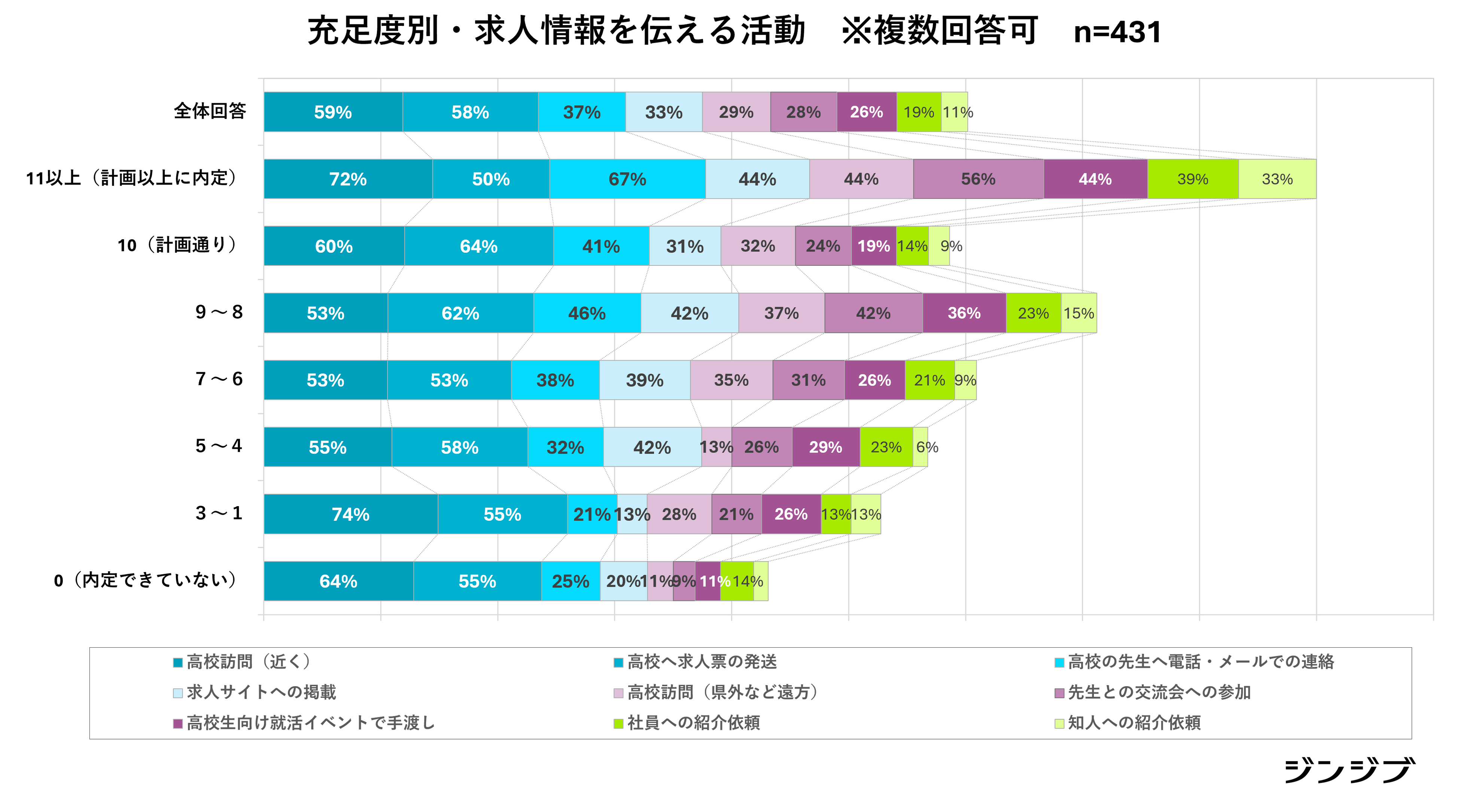 計画通りに採用充足できたと回答した方ほど、「高校訪問(近く)」「先生へ電話・メールで連絡」「先生との交流会」といった、学校との直接的な接点づくりに積極的でした。