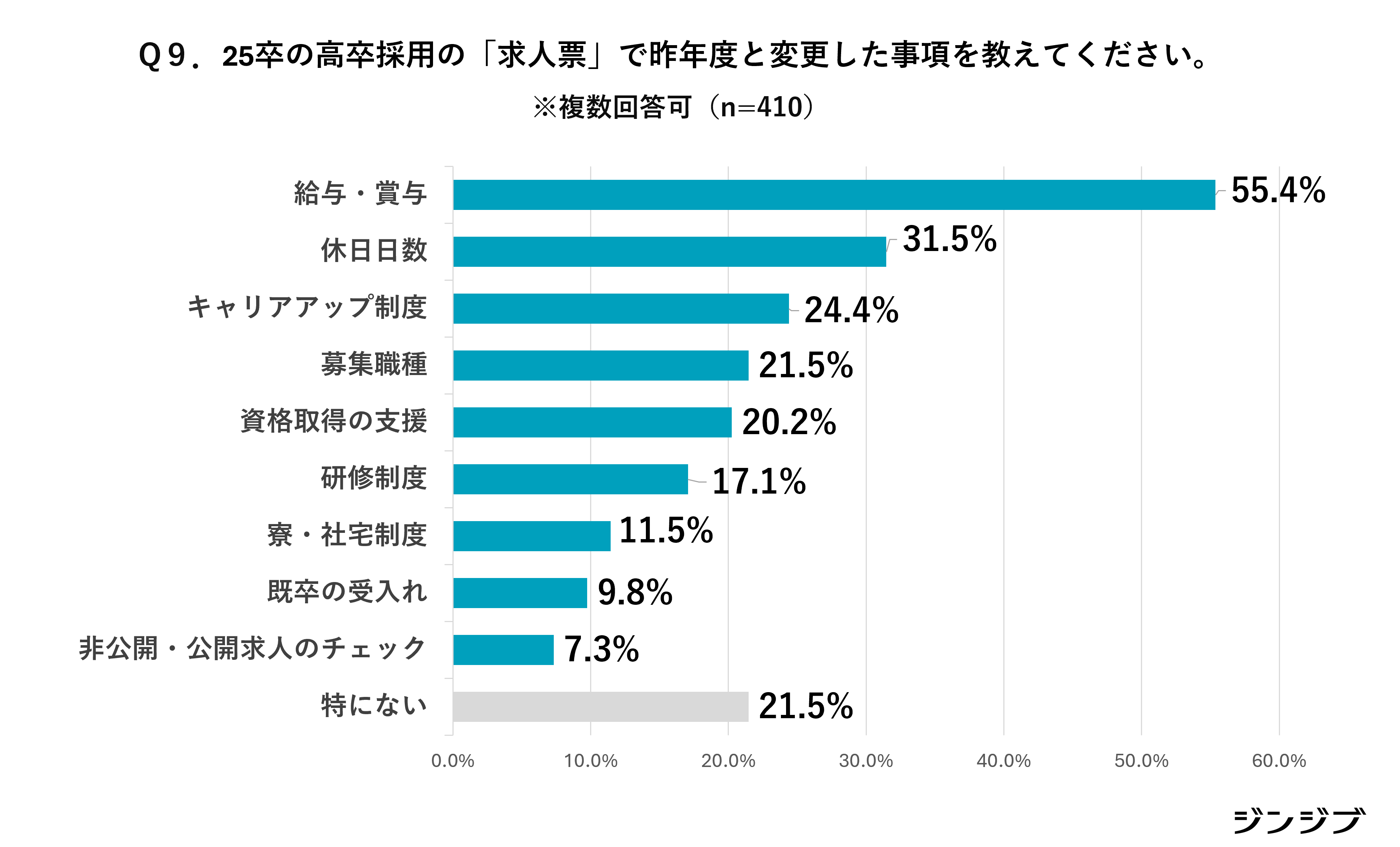 一方で、「特にない」と回答した企業は21.5%でした。昨年の回答33.8%に比べ減少していることから、高校生の応募意欲を上げるために募集要項を見直した企業は増えていると言えます。