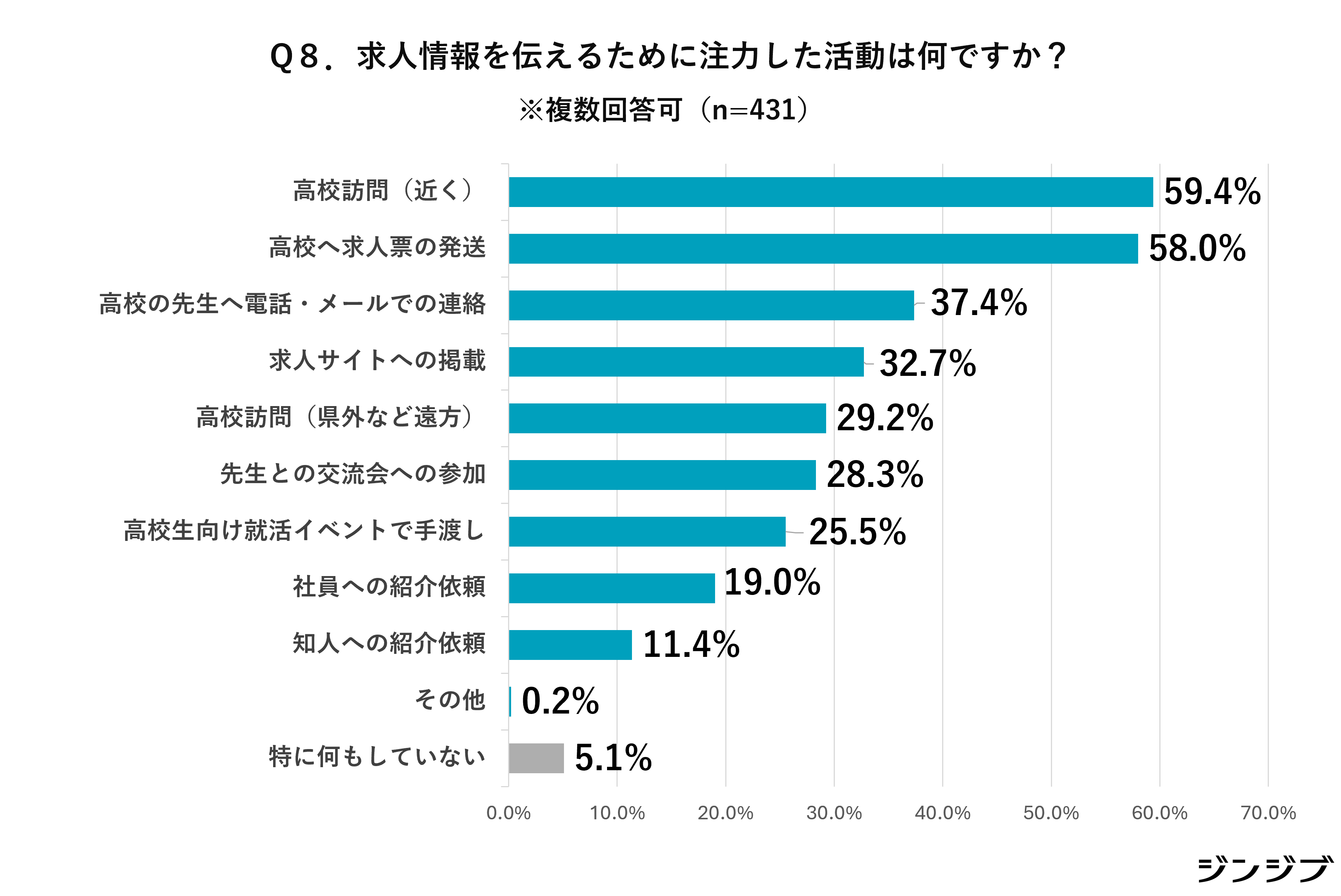 一方で、「特に何もしていない」の回答は5.1%にとどまり、多くの企業が積極的に高校や教員との接点を持ちながら採用活動を進めていることがうかがえます。