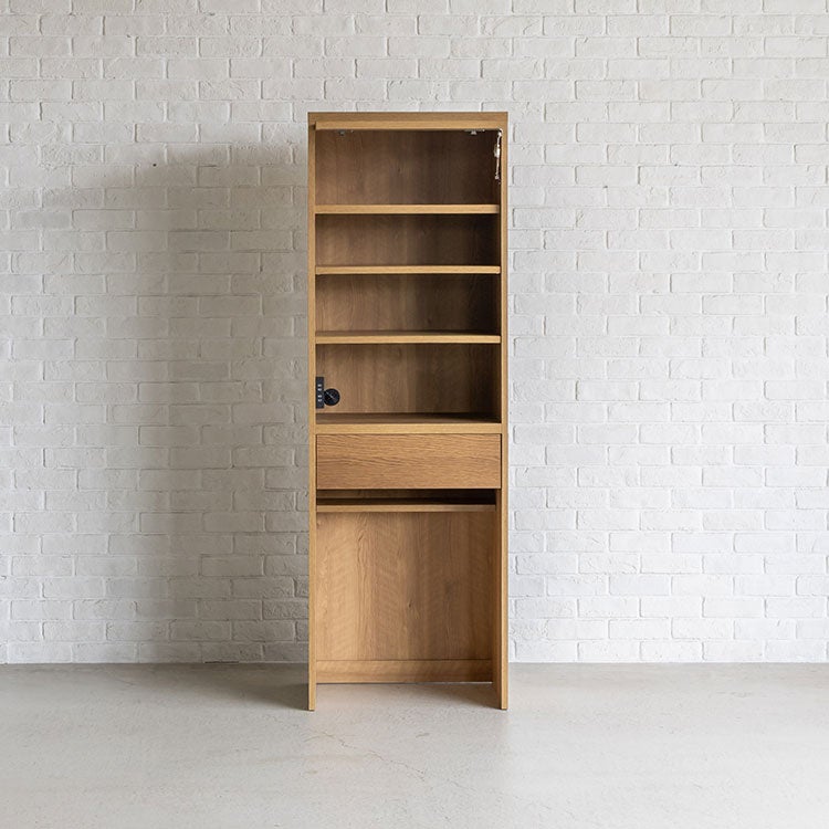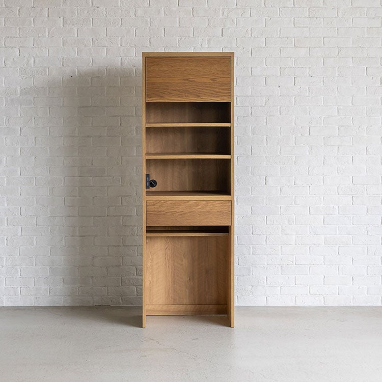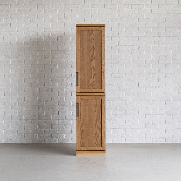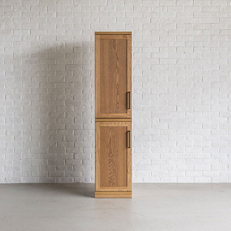 高さは1800mmでコンパクトな設計。日本人女性の平均身長でも上部の収納棚まで届き、取り出しやすい、使い勝手の良い高さです。一般的な冷蔵庫とも同じくらいの高さなので、並べて設置しても違和感なくまとまります。ウレタン塗装のため、毎日のお手入れもふき取るだけで簡単です。